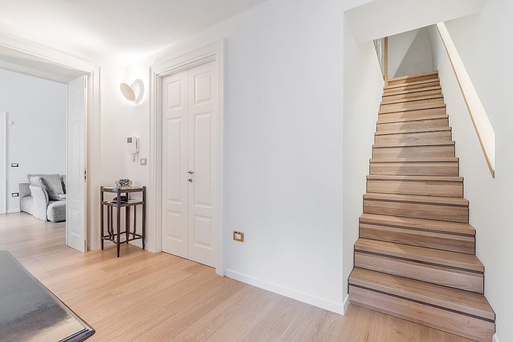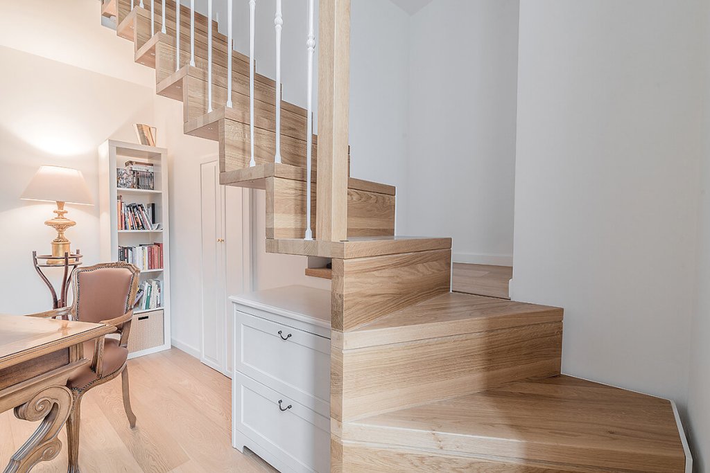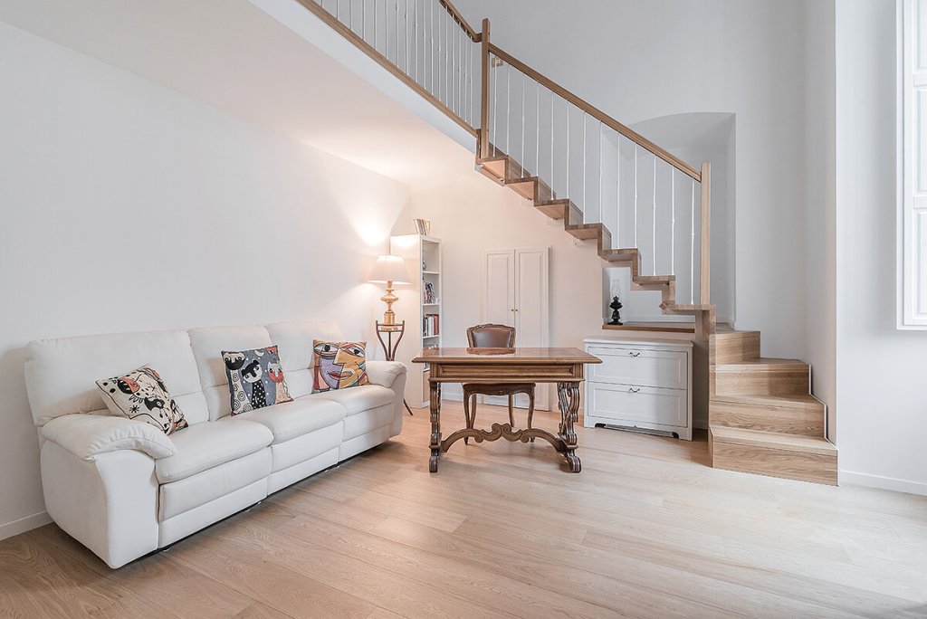 Data la grande altezza degli spazi sono stati creati due soppalchi, uno destinato a zona studio, l'altro a zona libreria. L'architetto ha scelto di sfruttare al meglio le nicchie e i vecchi camini trasformandoli in ripostigli, armadi a muro, librerie e di valorizzare ogni disimpegno, il sottoscala ad esempio diventa un armadio per il bagno. Le scale, progettate e realizzate su misura, diventano esse stesse dei contenitori, con un cassetto per ogni alzata mentre il corrimano è illuminato con una striscia led.