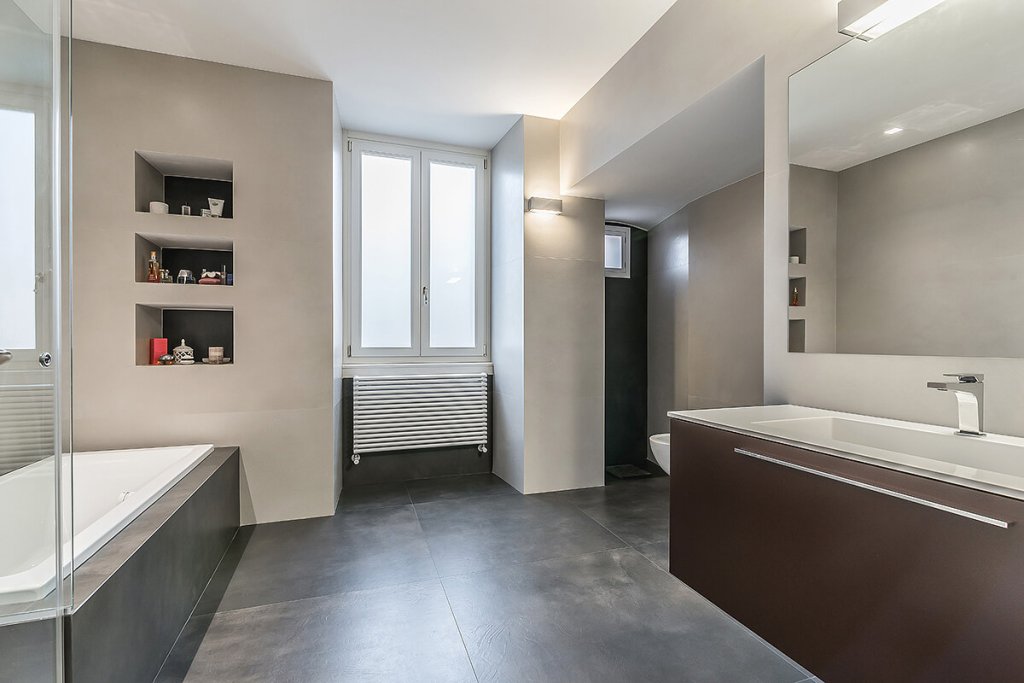 È stato infatti realizzato un riscaldamento a pavimento con lo scopo di eliminare i termosifoni e lasciare le pareti libere e di realizzare un impianto adatto per riscaldare in modo uniforme e prestante ambienti così grandi e con volte così alte. Una scelta rivolta anche al comfort interno perché i clienti adorano camminare scalzi sul pavimento riscaldato in parquet naturale.
