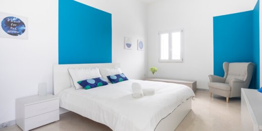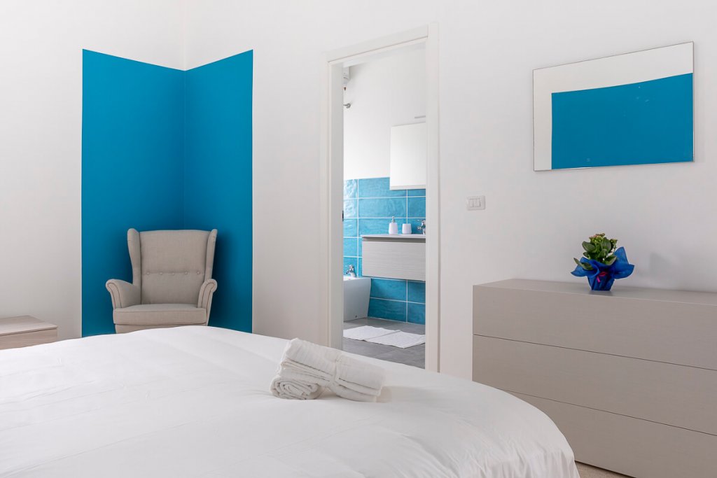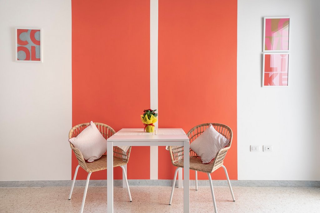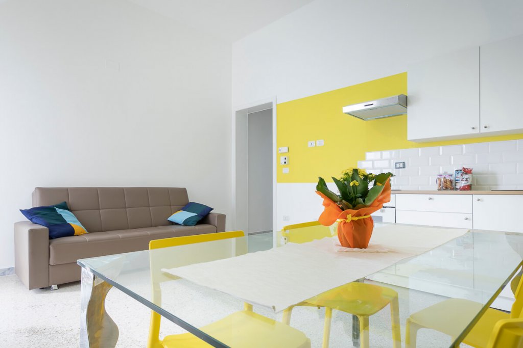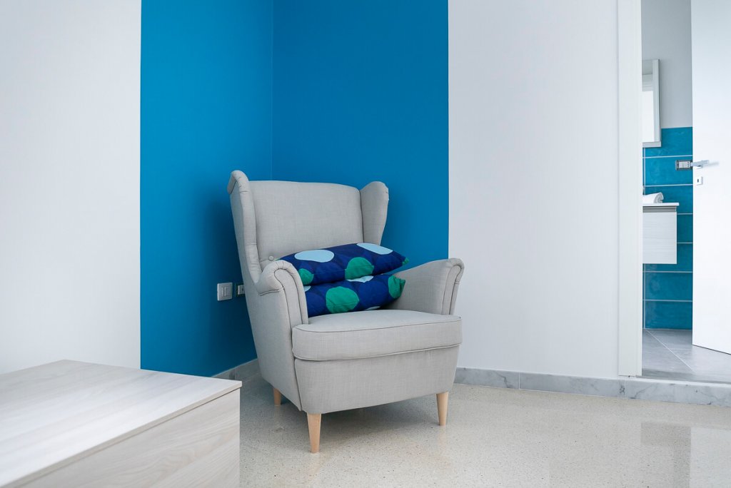 Rinnovare completamente un'abitazione per trasformarla in un b&b è facile se si viene affiancati da un'azienda professionale e da un Ingegnere come Clementina Crupi che, in questo bed & breakfast di Lecce, è riuscita a valorizzare e differenziare ogni stanza con semplicità, regalando un tocco di colore a tutti gli ambienti. Il pavimento originale in graniglia di marmo è stato mantenuto e rilucidato, mentre i rivestimenti e gli arredi sono stati totalmente rinnovati a favore di un look più giovanile e contemporaneo. Ogni stanza della casa vanta ora un colore proprio, dal blu al giallo passando per il corallo (molto di tendenza anche grazie al Pantone 2019 Living Coral). Le nuance degli arredi variano dal grigio al bianco, e ben si sposano con i rivestimenti scelti: mattoncini chiari lucidi in cucina come paraschizzi e piastrelle azzurre, verde menta e bianche nei due bagni. Particolare è la scelta della tinteggiatura nelle stanze. Il blu, ad esempio, fa da testiera al letto e marca l'angolo relax con la poltrona a contrasto; il giallo, al contrario, è stato steso in orizzontale sul perimetro della cucina, a richiamo delle nuance delle sedie e a contorno della parete attrezzata. Il corallo, infine, è stato scelto per la testata della seconda camera da letto e per incorniciare (con due strisce verticali) l'angolo con il tavolo e le sedie in vimini.