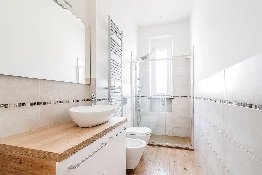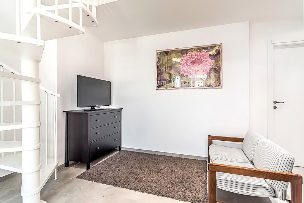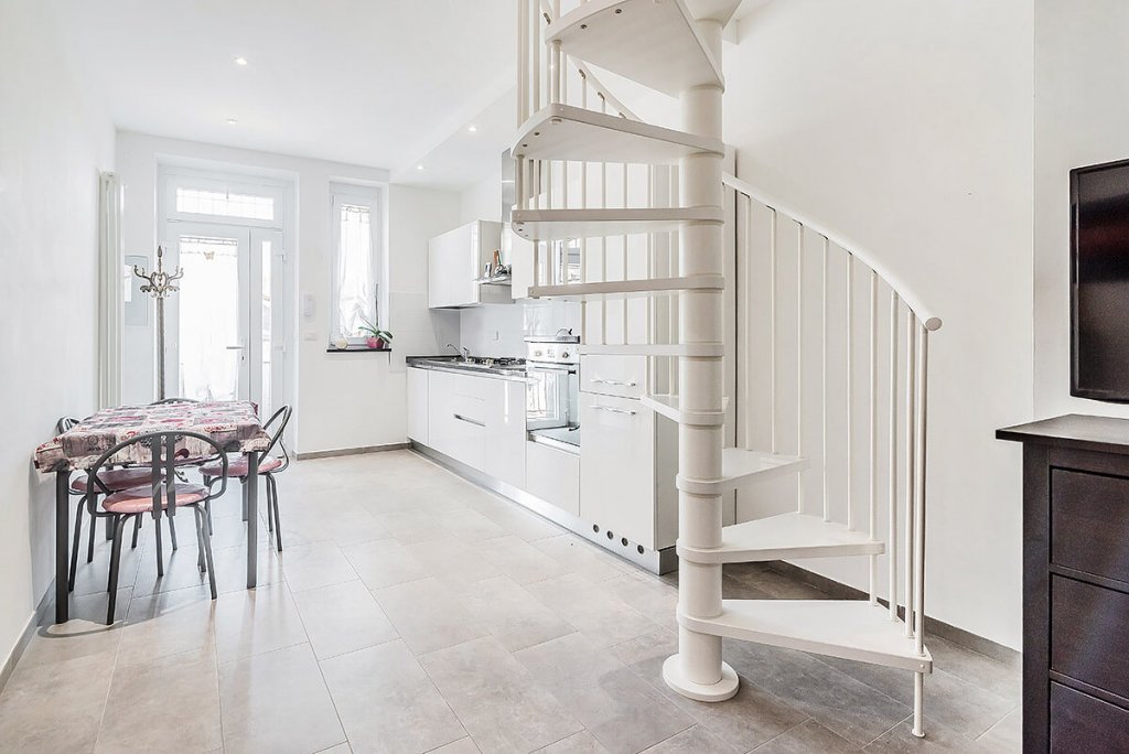 Ristrutturazione completa di un appartamento di circa 100 mq situato a Torino in zona Borgo Vittoria. L'intervento ha previsto l'ammodernamento dell'immobile, con la realizzazione di una zona giorno open space con cucina a vista e di una zona notte con due camere da letto ed un bagno. La scala a giorno a chiocciola, che mette in collegamento il soggiorno con il sottotetto, diventa elemento dominante nello spazio, separando idealmente la zona pranzo dalla zona relax e rendendo l'ambiente dinamico e fluido. Ma la vera protagonista di questa casa è la luce, valorizzata da rivestimenti in grès effetto cemento dalle tonalità chiare e da pareti e arredi di colore bianco, che contribuiscono a far sembrare lo spazio ancora più ampio. Nel bagno i toni sono più caldi grazie all'uso di rivestimenti in grès effetto cemento con motivi floreali per le pareti ed effetto legno per la pavimentazione, che ben si abbina all'arredo in legno naturale.