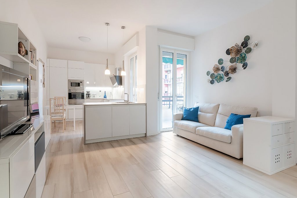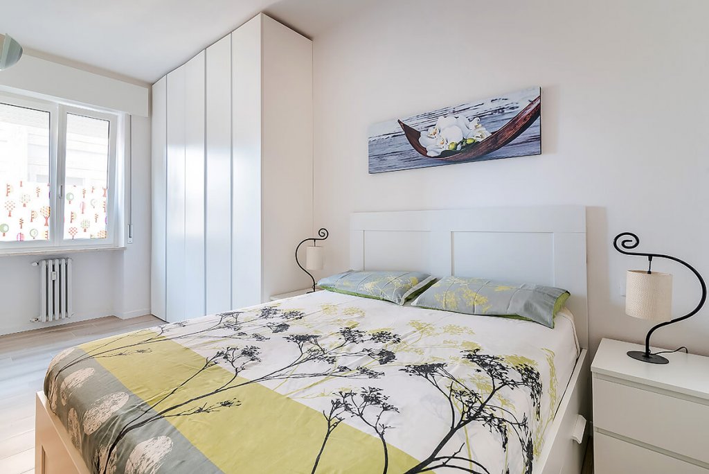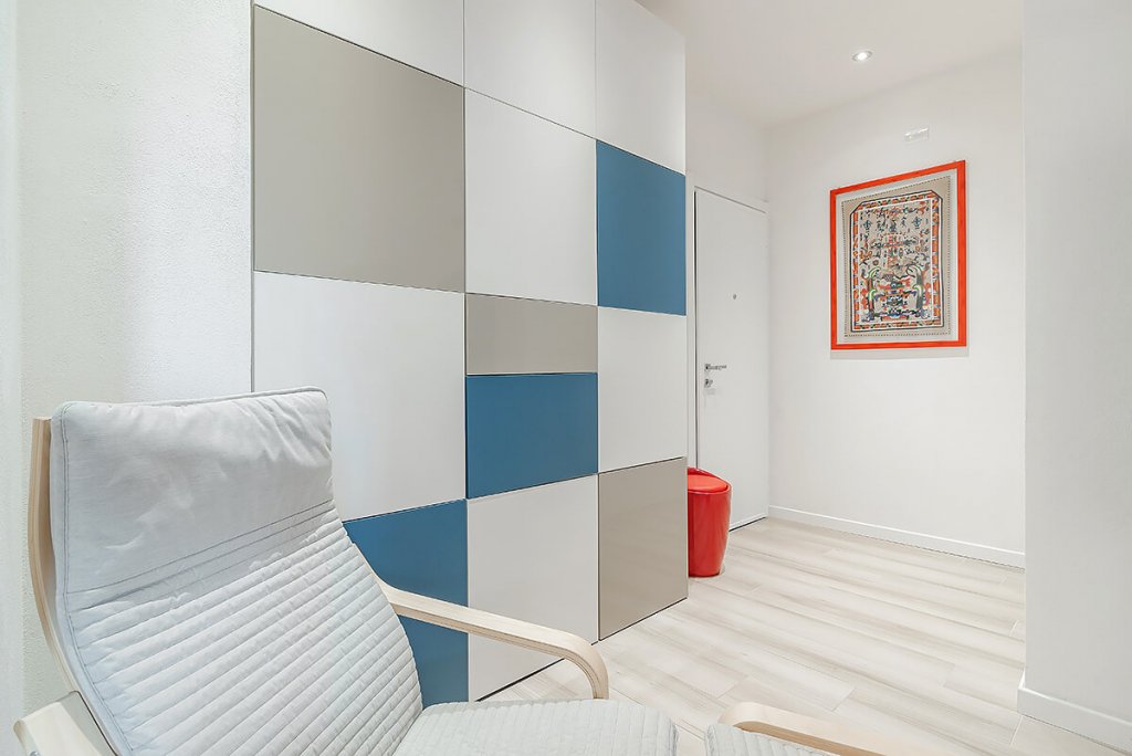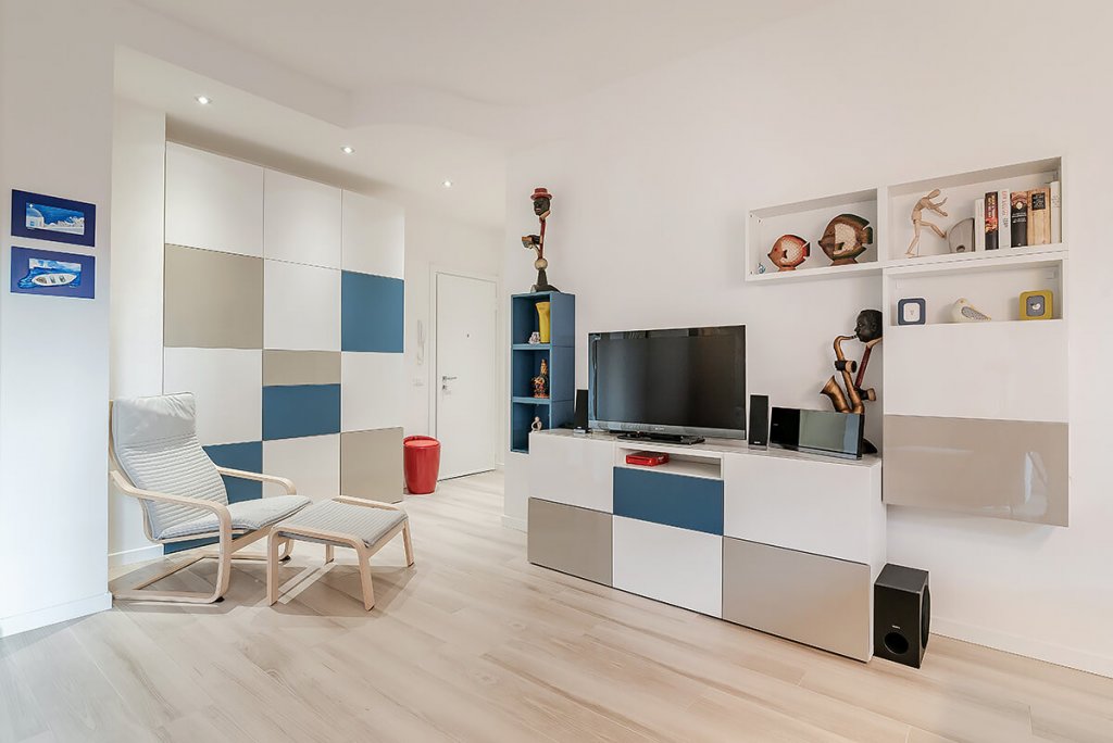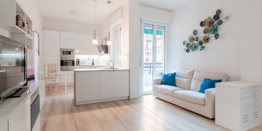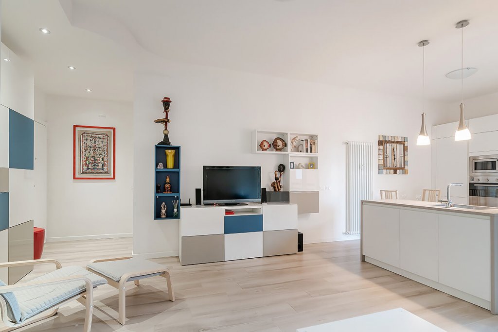 Spazi ariosi e un gusto moderno dalle declinazioni nordiche caratterizzano i 60mq ristrutturati a Verona dall'Arch. Sofia Bertoldi. Appena entrati in casa si viene subito accolti da un Open Space contemporaneo con cucina a vista e isola sapientemente disposta tra zona pranzo e soggiorno, dove è stato posato un elegante grès effetto legno quercia. È il bianco a predominare in questo ambiente unico: oltre che sulle pareti, viene infatti richiamato dalla cucina, dal divano, dalla parete attrezzata della tv e dai mobili. Piacevolmente alternato al blu e al beige, questa tinta neutra dona luminosità all'ambiente, già illuminato artificialmente da faretti integrati al controsoffitto e due sospensioni disposte sopra l'isola centrale. Procedendo verso la zona notte si incontra una cameretta, una camera matrimoniale con bagnetto e un secondo bagno. Anche qui sono i toni chiari a far da padroni, sia sulle pareti che nell'arredamento. Particolare è la scelta dei rivestimenti attuata per il bagno più grande, che vanta una doccia disposta in lunghezza sotto la finestra e sanitari sospesi. In questa stanza è stato posato un grès effetto legno come pavimentazione e un grès opaco panna con striscia centrale in rilievo per il resto delle pareti, decorate fino a 2m di altezza. Scopri la sede di Facile Ristrutturare a Verona!