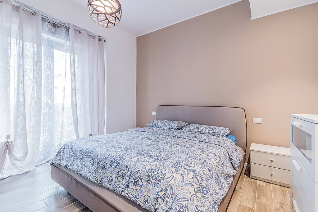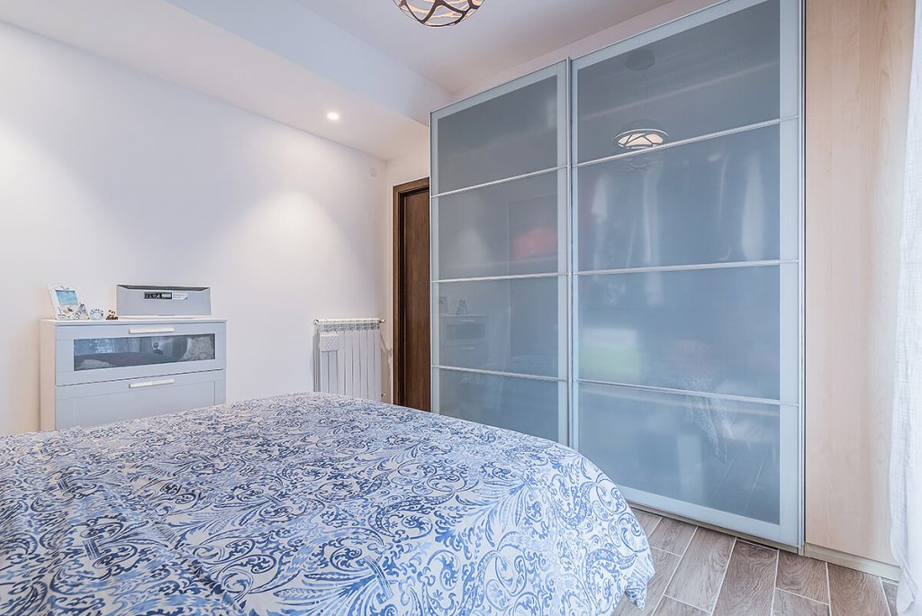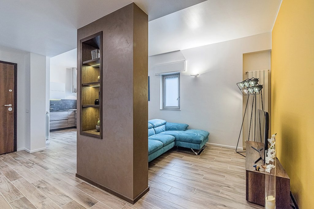 Ristrutturazione completa di un appartamento situato a Bagheria: il progetto di ristrutturazione nasce dall'esigenza di realizzare una nuova distribuzione degli spazi, sfruttando al massimo lo spazio di ogni singolo ambiente della casa di circa 65 mq. La zona giorno e l'ingresso sono stati aperti realizzando un ampio e luminoso open space con zona living e cucina a vista, caratterizzati da arredi moderni e di design. Varcato l'ingresso troviamo la zona di distribuzione degli ambienti con porte filo muro artigianali che diventano quasi invisibili e un controsoffitto in cartongesso con faretti da incasso. Ma la vera protagonista del progetto è una libreria incassata che separa l'ingresso dal soggiorno e diventa punto visivo focale dell'ambiente. Spiccano inoltre i colori utilizzati nell'open space: giallo acceso per la parete che fa da quinta, azzurro cielo per il divano e marrone per il setto con la libreria tinteggiato con finitura ad effetto cemento. Dettagli color giallo sono riproposti anche nella cucina, alternati a tinte naturali del legno per gli sportelli e per il tavolo ed al nero effetto cemento per il piano di lavoro ed il paraschizzi. In camera da letto e nel bagno troviamo invece varie tonalità del color beige e del tortora, con una parete tinteggiata a fare da fondale al letto e rivestimenti in grès Bardelli con disegni floreali per il bagno. Anche la pavimentazione di tutto l'appartamento è stato realizzata in grès, con piastrelle ad effetto parquet.