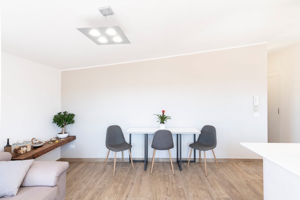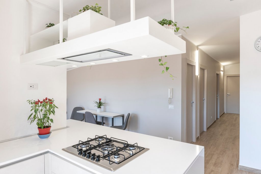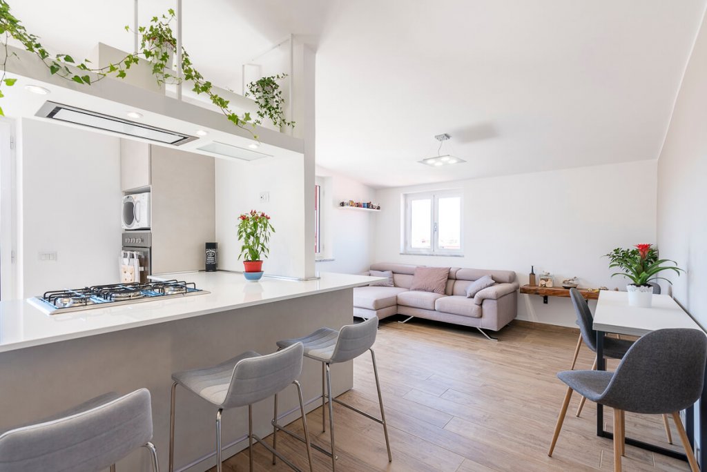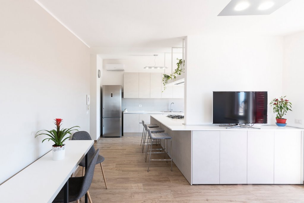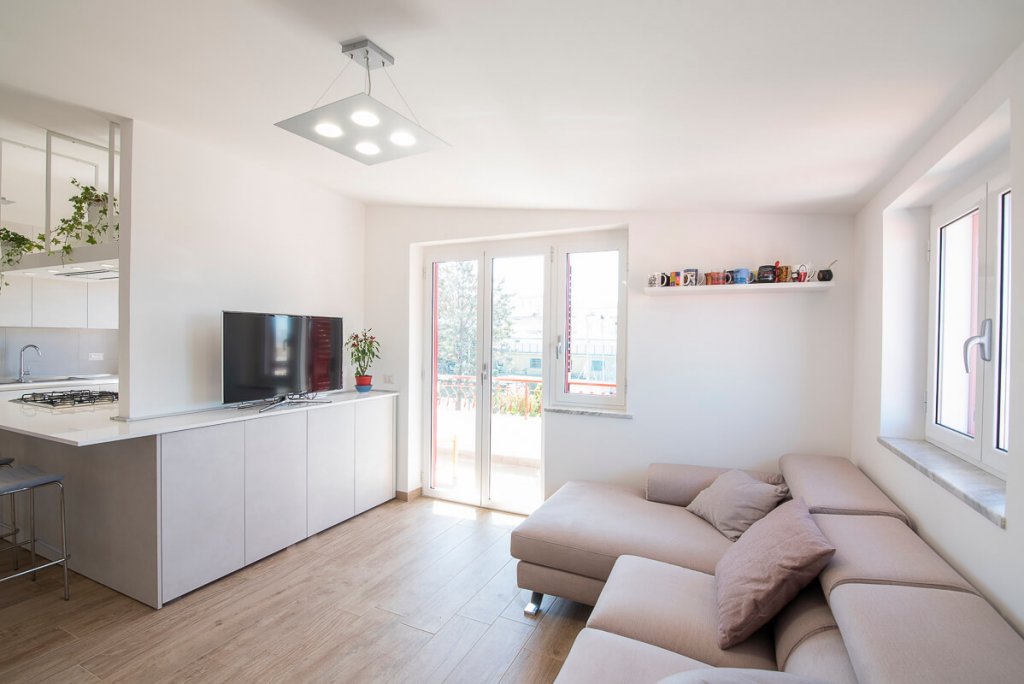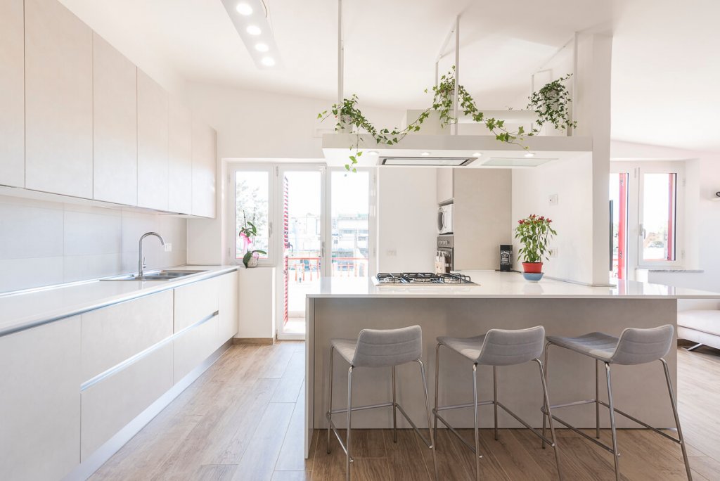 È il bianco a far da padrone in questo elegante appartamento di 95mq. ristrutturato a Napoli (zona San Sebastiano al Vesuvio) dall'Arch. Alfonso Vitolo. A guidare la ristrutturazione è stata la necessità ridistribuire gli spazi, con conseguente ammodernamento dello stile della casa e creazione di un funzionale open-space in cui sono racchiusi living, zona pranzo e cucina a vista. Lo spazio è stato progettato in maniera strategica, per fare in modo che le diverse aree comunichino tenendo però ognuna la propria identità e "riservatezza". La cucina color panna, infatti, sviluppata linearmente sulla parete di sinistra, è frontale rispetto al tramezzo che la divide dal living: una costruzione inedita e disegnata ad hoc per integrare anche la cappa artigianale, un mobile a sospensione e il tavolo all'americana. Parliamo di una cucina a penisola di tendenza, unica nel suo genere, che ruotando intorno al tramezzo diventa mobile per la tv. Dopo aver visitato il cuore della casa, in cui si colloca anche un mensolone in legno resinato posizionato nel living, si accede alla zona notte, con due bagni e camera da letto. Questi tre spazi sono caratterizzati da tinte neutre e mobili in tinta. In entrambi i bagni sono state inserite due docce, la prima con rivestimento ondulato bianco a parete e la seconda con gres effetto legno, che riprende la pavimentazione e contrasta le nuance grigie della stanza.