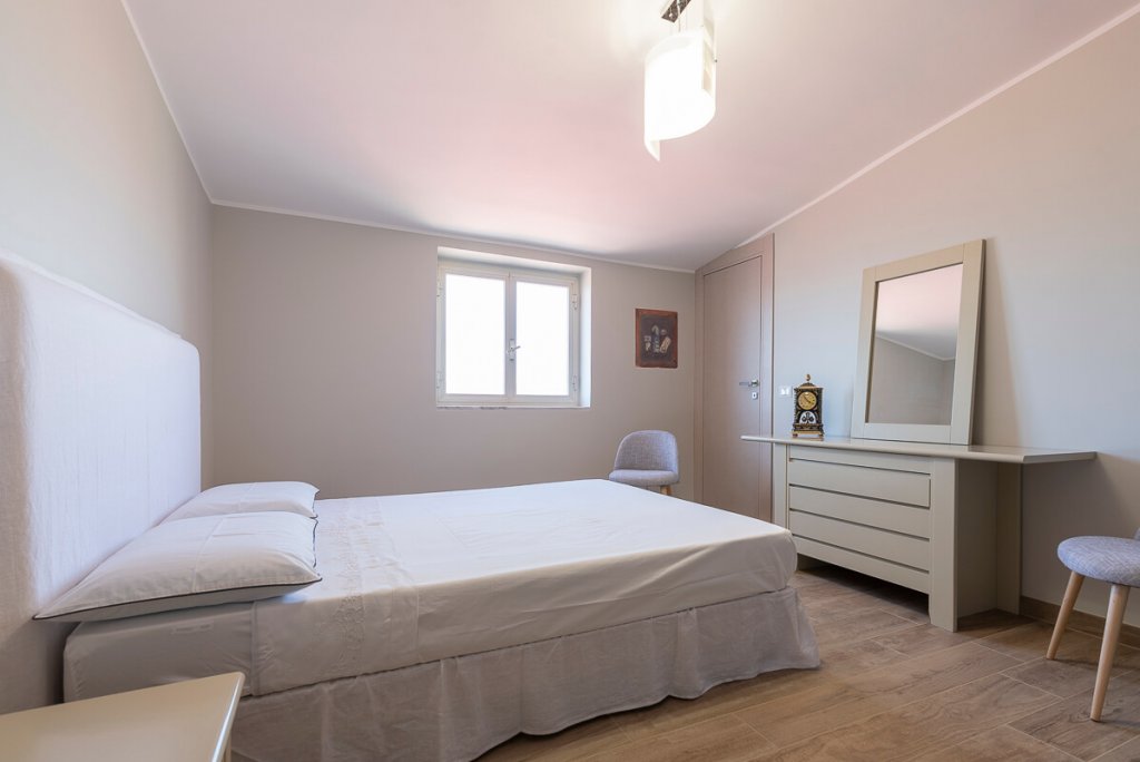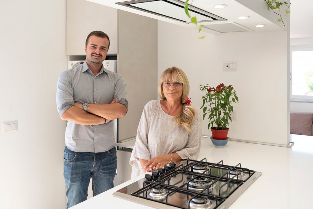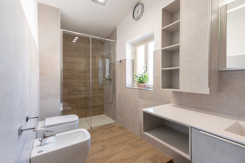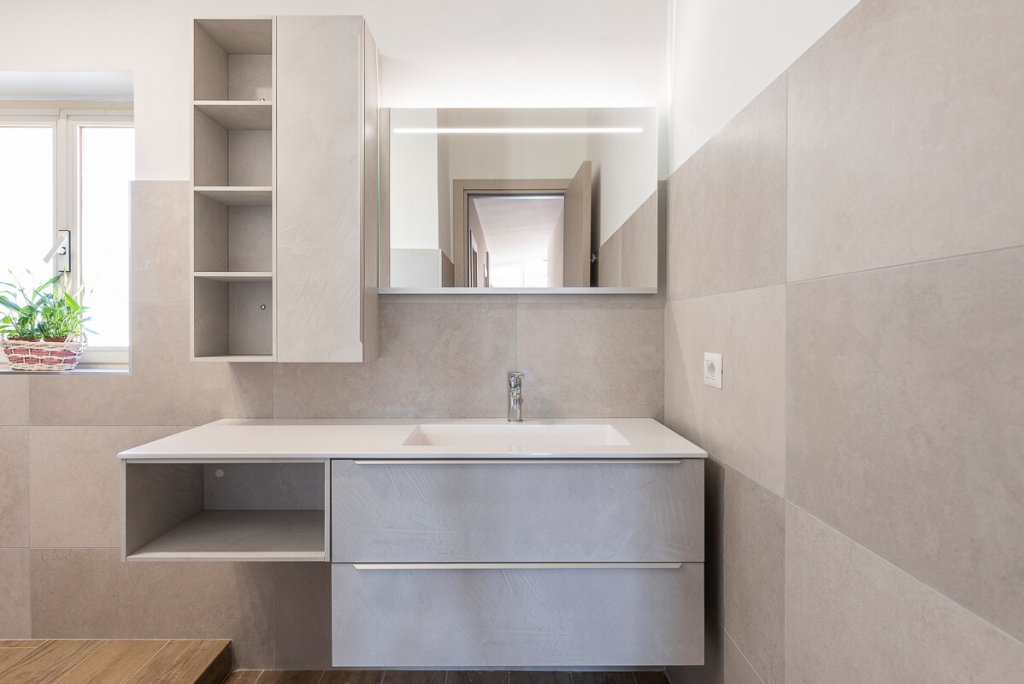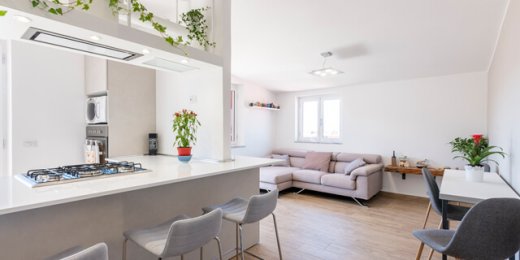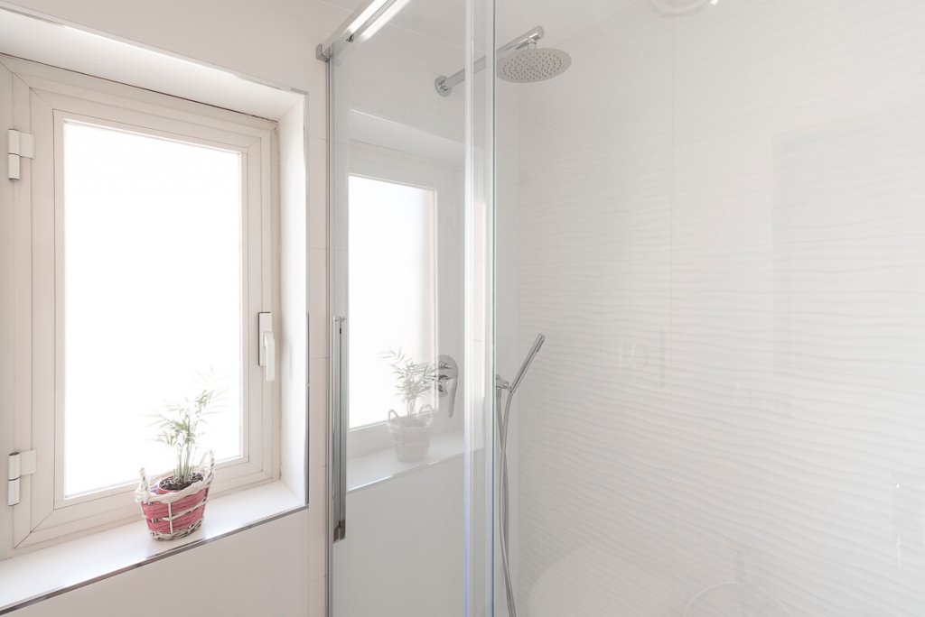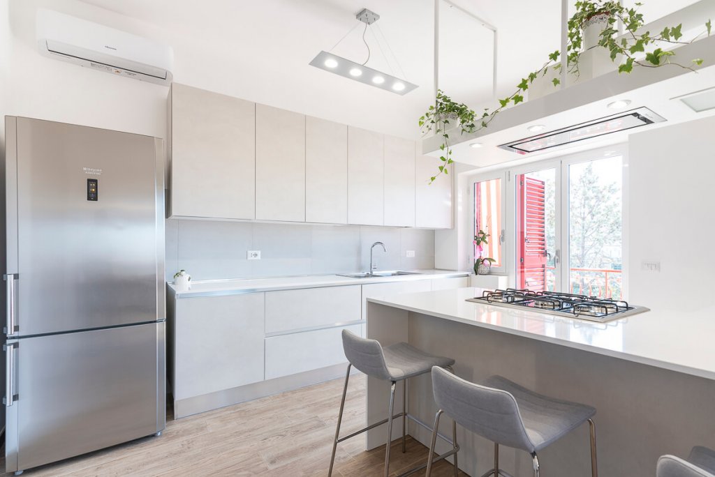È il bianco a far da padrone in questo elegante appartamento di 95mq. ristrutturato a Napoli (zona San Sebastiano al Vesuvio) dall'Arch. Alfonso Vitolo. A guidare la ristrutturazione è stata la necessità ridistribuire gli spazi, con conseguente ammodernamento dello stile della casa e creazione di un funzionale open-space in cui sono racchiusi living, zona pranzo e cucina a vista. Lo spazio è stato progettato in maniera strategica, per fare in modo che le diverse aree comunichino tenendo però ognuna la propria identità e "riservatezza". La cucina color panna, infatti, sviluppata linearmente sulla parete di sinistra, è frontale rispetto al tramezzo che la divide dal living: una costruzione inedita e disegnata ad hoc per integrare anche la cappa artigianale, un mobile a sospensione e il tavolo all'americana. Parliamo di una cucina a penisola di tendenza, unica nel suo genere, che ruotando intorno al tramezzo diventa mobile per la tv. Dopo aver visitato il cuore della casa, in cui si colloca anche un mensolone in legno resinato posizionato nel living, si accede alla zona notte, con due bagni e camera da letto. Questi tre spazi sono caratterizzati da tinte neutre e mobili in tinta. In entrambi i bagni sono state inserite due docce, la prima con rivestimento ondulato bianco a parete e la seconda con gres effetto legno, che riprende la pavimentazione e contrasta le nuance grigie della stanza.