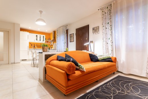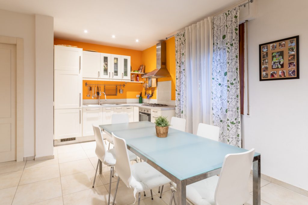 L’ingresso dell’appartamento si apre su open space con piano cottura e piccola area conversazione di circa 30 mq in cui dominano i colori bianco e arancione uniti ad un sistema di illuminazione moderno che dona alla stanza spaziosità e ampia prospettiva. In corrispondenza del piano di lavoro della cucina troviamo dei faretti che elegantemente si adattano all’ambiente e lo rendono funzionale.
