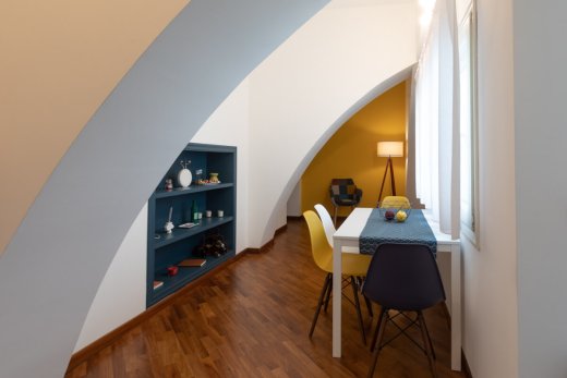 Un tocco originale e di grande grande impatto visivo è dato dalla realizzazione di archi e semi archi presenti in tutta la casa, che rendono visivamente gli ambienti eleganti e ricercati: presenti sia in cartongesso nella zona giorno sia dipinti sulle pareti del corridoio e della camera da letto, regalano una nota architettonica di gusto che enfatizza nel modo giusto il passaggio da una stanza all’altra e al tempo stesso mantiene una piacevole continuità visiva.