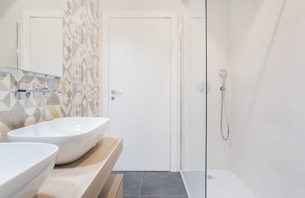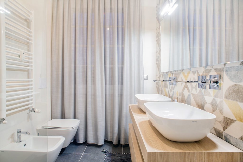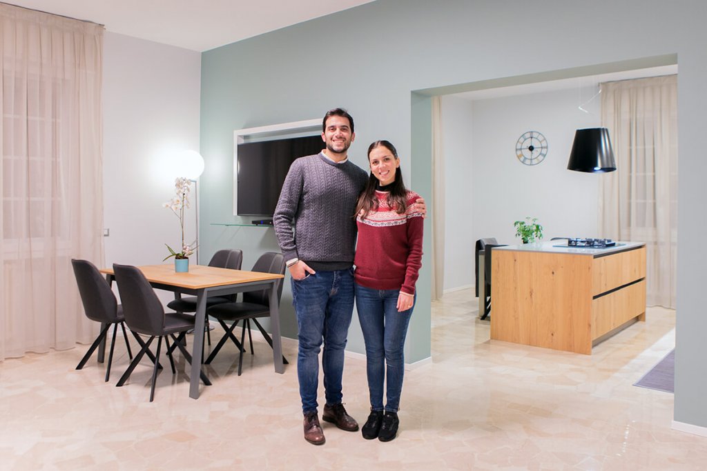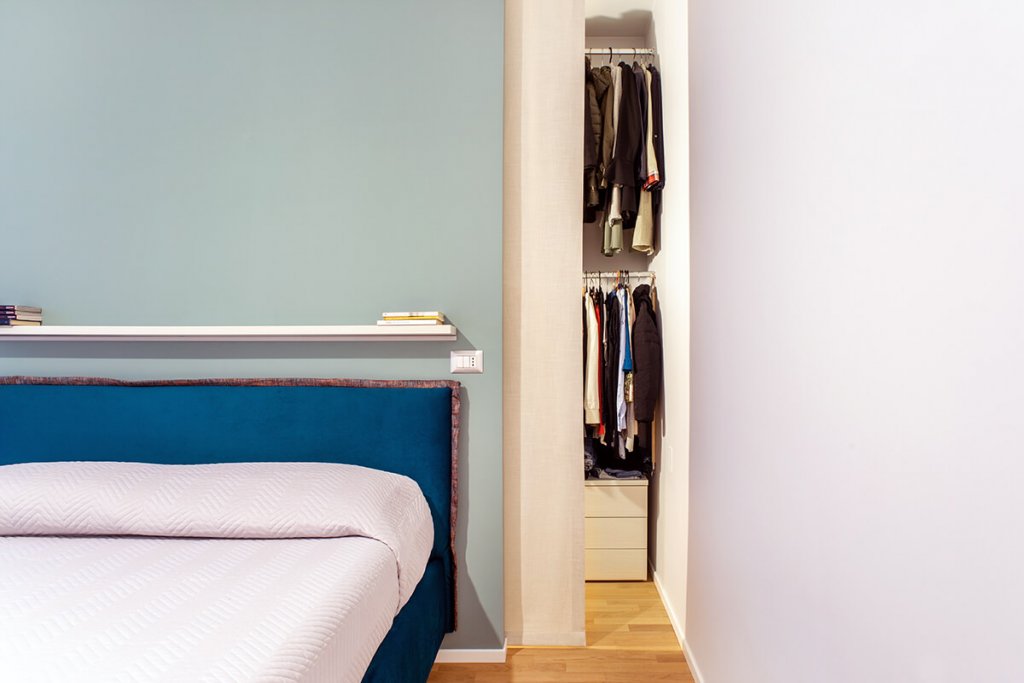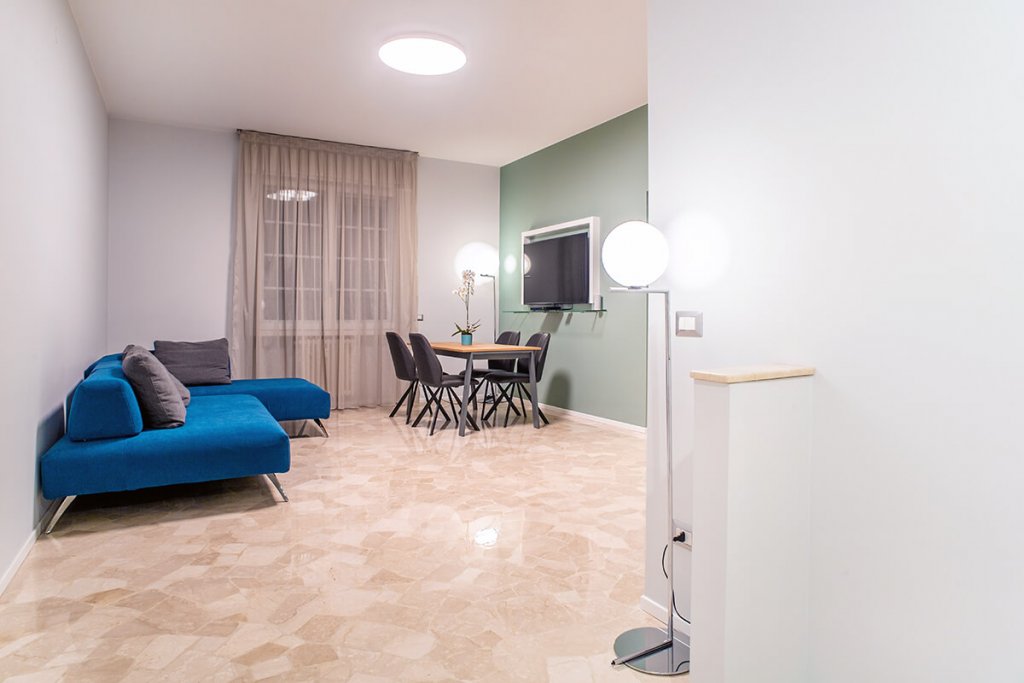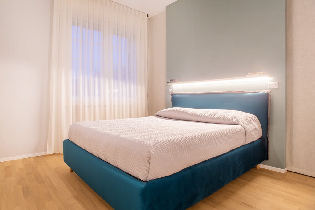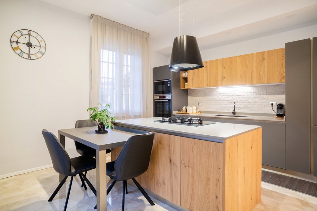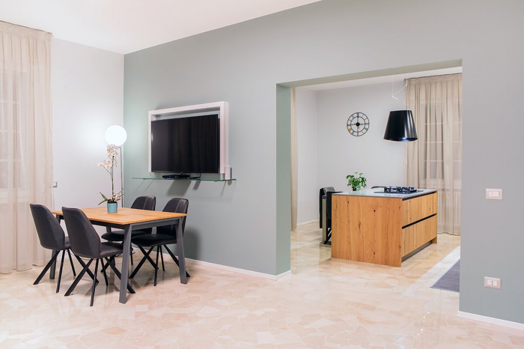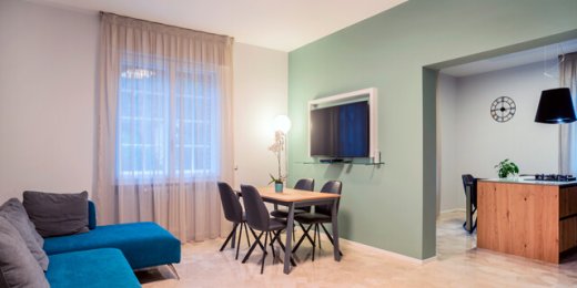 Modernità e colore per una ristrutturazione di tendenza guidata dall'Arch. Mattia Celiento a Brescia. Cento metri quadrati ripensati completamente con una nuova distribuzione degli spazi interni, che ha favorito la creazione di un'ampia zona living con cucina semi-separata attraverso una parete portante valorizzata da una tonalità verde muschio, una camera da letto e due bagni. Una volta varcata la porta d'ingresso si accede subito all'open space, diviso tra zona pranzo e cucina, con isola in legno di rovere chiaro e nodoso e vetro opaco trattato per i piani di lavoro. La cappa di design inserita sopra i fornelli riprende con il colore le sedie e i dettagli dello spazio, mentre l'antracite dei pannelli del mobile attrezzato contrasta con eleganza il marmo levigato, posato in cucina e soggiorno, illuminato da lampade di Flos in soggiorno. Procedendo verso la zona notte si incontrano tre camere, con pavimento in parquet effetto rovere, e due bagni, totalmente ristrutturati. In una delle stanze matrimoniali torna il color muschio, utilizzato per la parete di testata del letto, inserita come divisione tra camera e cabina armadio. Completano l'elegante casa riprogettata all'interno di un edificio storico i due bagni, entrambi con cementine e sanitari sospesi di ultima generazione.