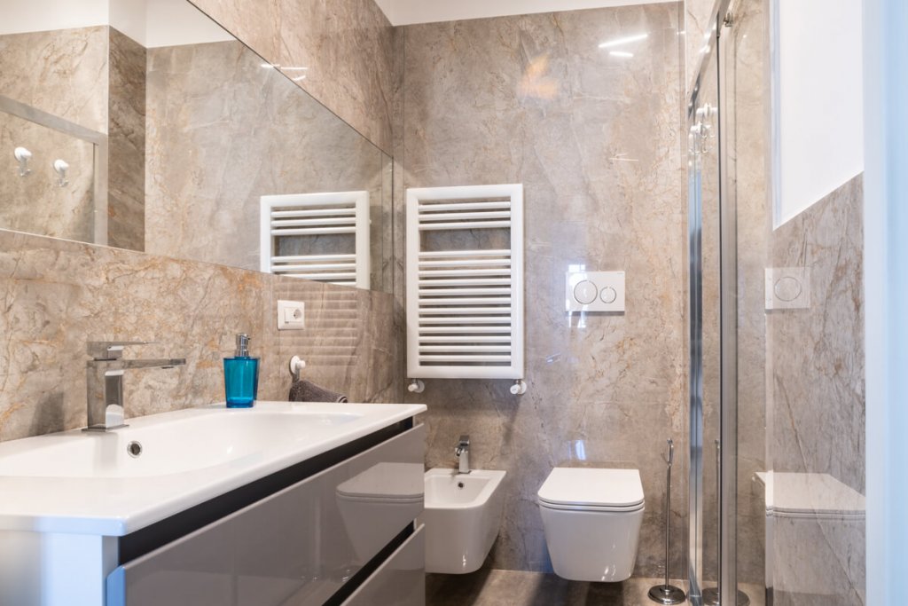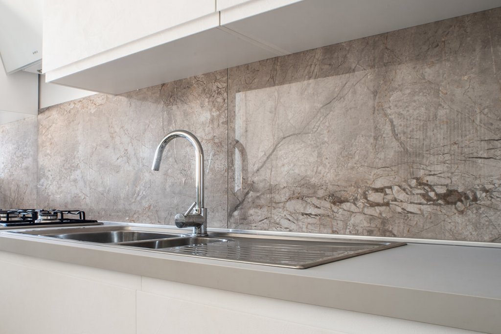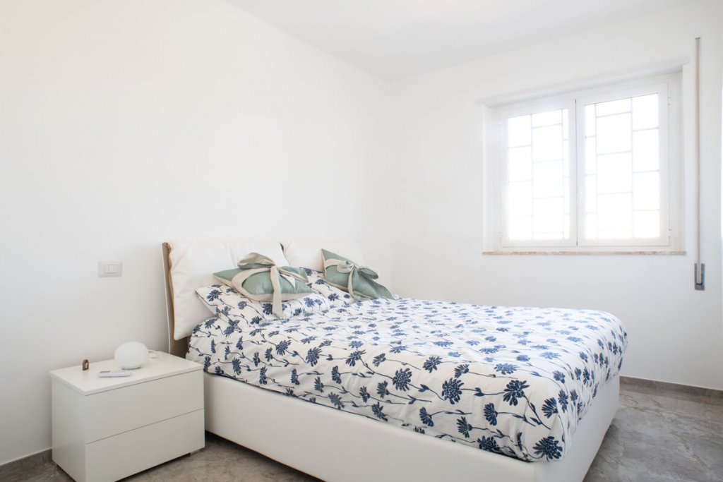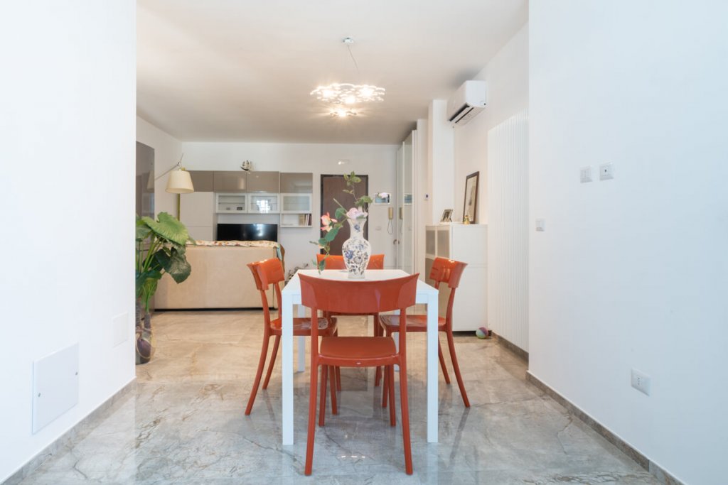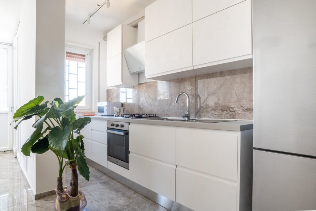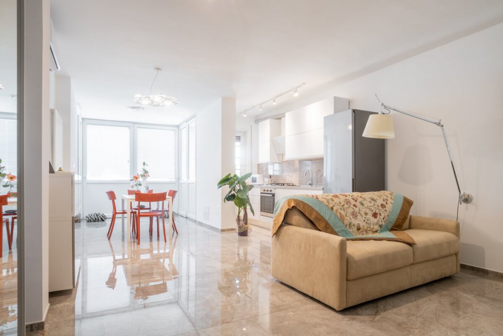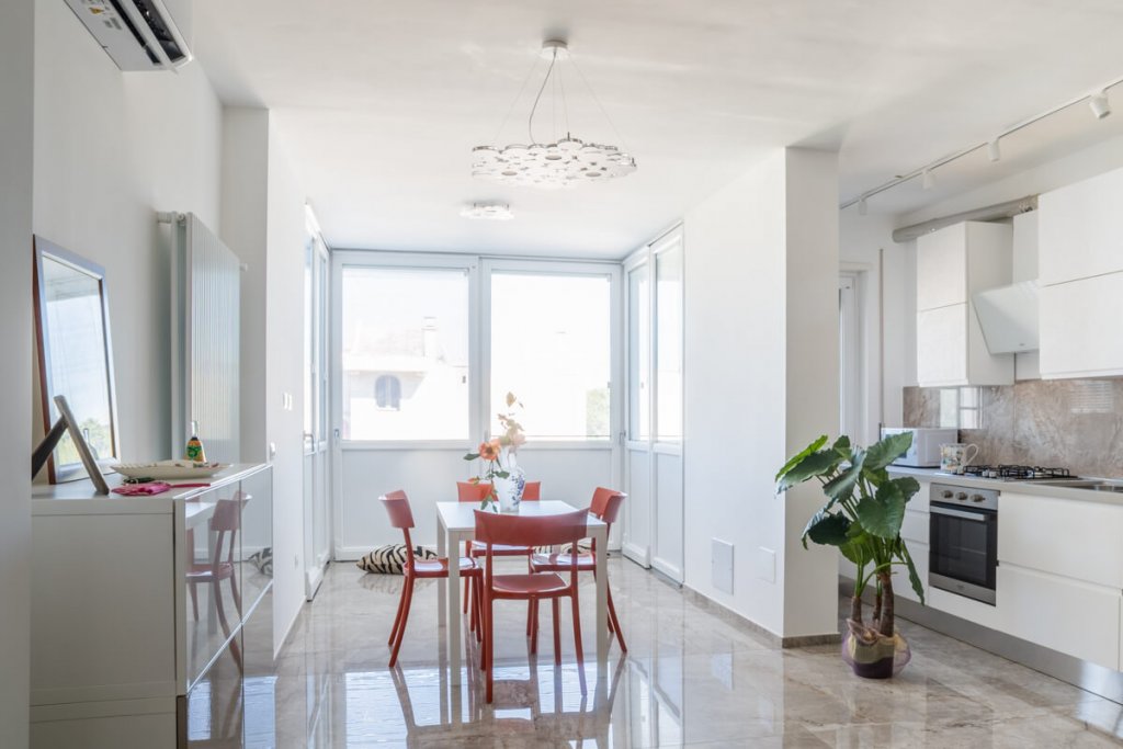 La ristrutturazione di questo appartamento di 45mq. a Bari, zona Torre a Mare, ha ruotato intorno alla necessità di ridistribuire gli spazi interni, con conseguente cambio dell'aspetto dell'appartamento e della sua funzionalità. Accedendo alla casa si viene subito accolti da un luminoso open space, dove living e cucina dialogano e si affacciano l'uno sull'altro senza però interferire nei relativi spazi: la zona pranzo, infatti, rimane ben divisa da quella relax, che a sua volta è separata dalla cucina lineare color bianco. Particolare è il paraschizzi, in grès porcellanato effetto marmo, esattamente come il pavimento che è stato scelto per tutto l'appartamento: grandi lastre quadrate dalle nuance grigie e le venature bianche e antracite. Lo stesso design si trova anche nel bagno, con sanitari sospesi e rivestimenti di grande formato 120 x 240. Chiude la casa una comoda stanza da letto, con letto matrimoniale e total white sulle pareti.