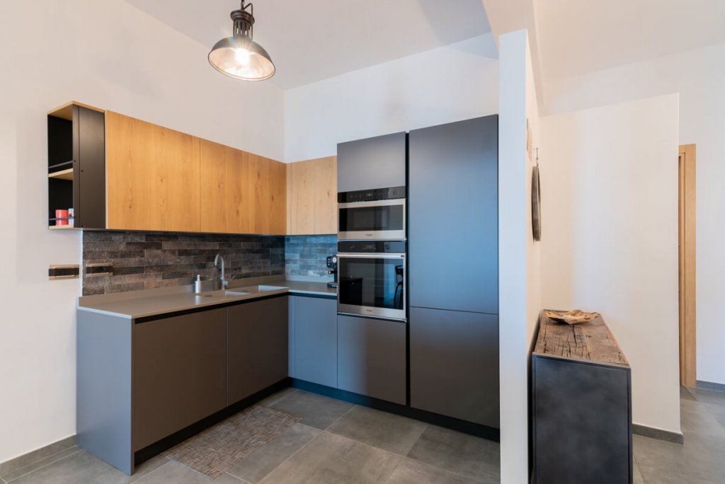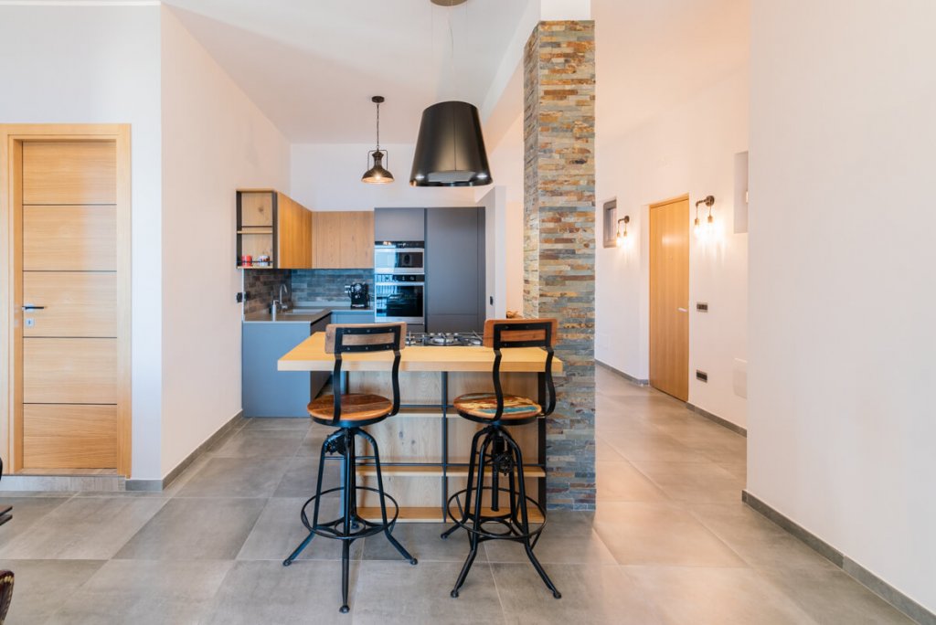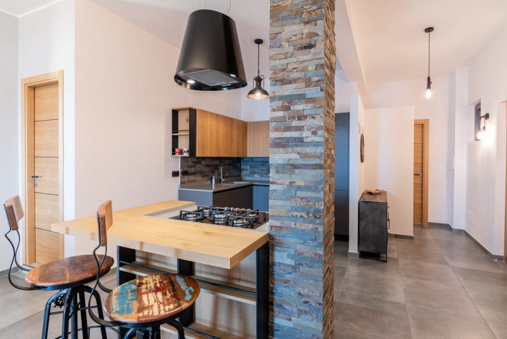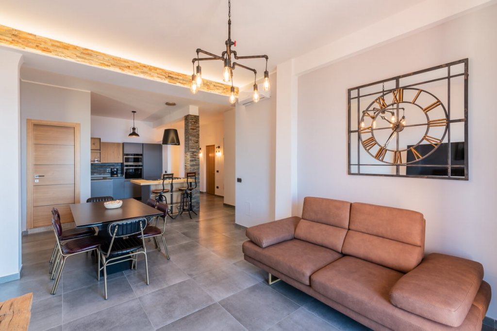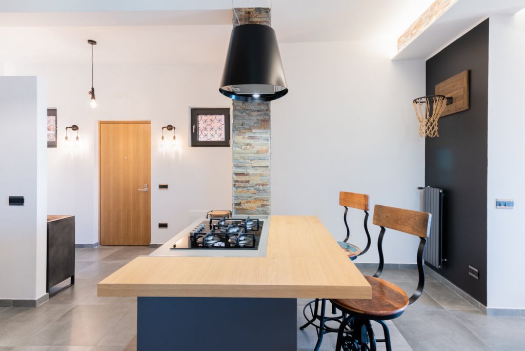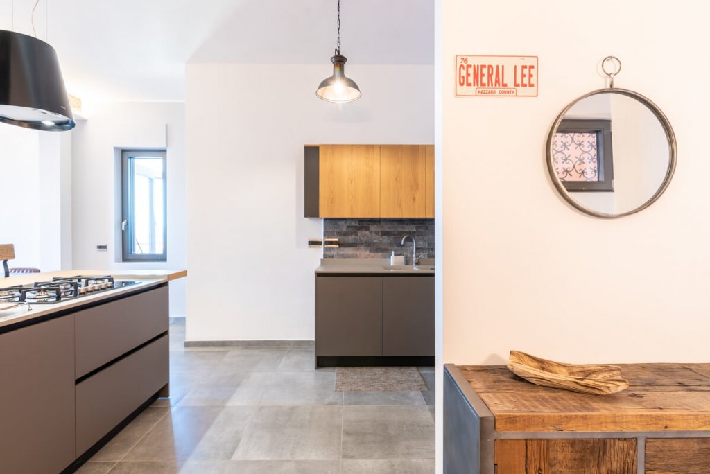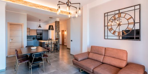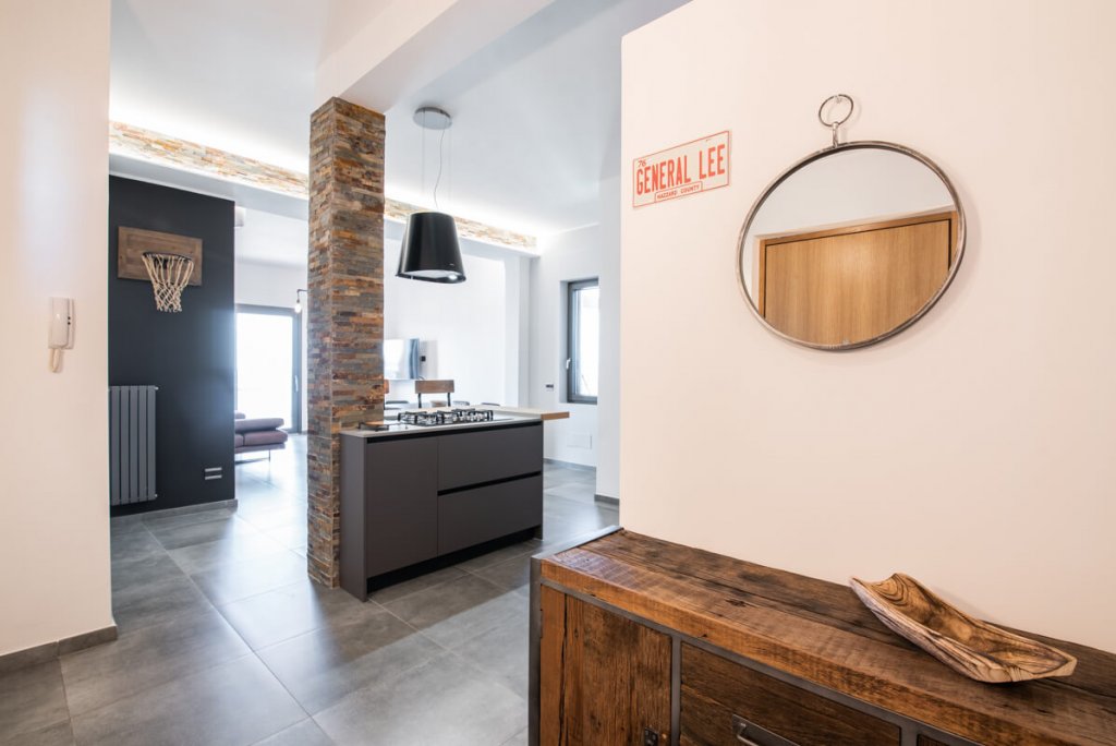 Si dice che l’eleganza sia buon gusto con un pizzico di audacia. A dare un volto a questa concezione di casa è l'appartamento di 87mq. ristrutturato a Bagnoli (Napoli) dall'Arch. Olga Colella, dove l'attenzione ai dettagli è massima, le tinte dialogano con classe e il design fa da padrone. Una casa trendy, accogliente e dal carattere industrial, caratterizzata da una nuova distribuzione degli spazi e da un open space degno di nota. Porte in legno, cucina dalle nuance antracite con penisola centrale appoggiata ad una elegante colonna rivestita in mattoncini, sgabelli alti e sospensioni/applique con tubature a vista. Ogni elemento inserito nello spazio sembra disegnato ad hoc, in una sintonia di forme e materiali che attrae sin dal primo accesso in casa. In terra, è stato posato un grès porcellanato effetto cemento che contrasta con sapienza il divano in pelle e richiama lo stile del grande specchio con orologio appeso di fronte alla tv (e al delizioso mobile fatto a mano in legno situato alla base). Gli infissi scuri donano un gusto di "loft" all'appartamento, composto da open space, due bagni e stanza matrimoniale. Nel primo bagno, con pavimento in grès porcellanato effetto legno e doccia con profili neri, spiccano la parete del lavabo con piastrelle esagonali bicolore (vinaccio e grigio), i sanitari sospesi, il termoarredo total black e la rubinetteria nera. Nel secondo, rigorosamente di tendenza come il resto della casa, vengono riproposti i sanitari sospesi e ruba il cuore la doccia, rivestita totalmente in grès effetto pietra, che si lega perfettamente con la cornice posata a mezza altezza sopra le piastrelle bianche. Chiude la casa una spaziosa stanza matrimoniale, con testata del letto in legno (con illuminazione integrata!) e armadiature nascoste dalla parete che dà le spalle al letto, tinteggiata in blu notte. Classe, stile e ricercatezza: un connubio a cui ogni casa vorrebbe aspirare!
