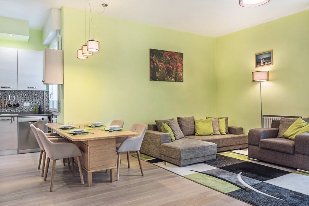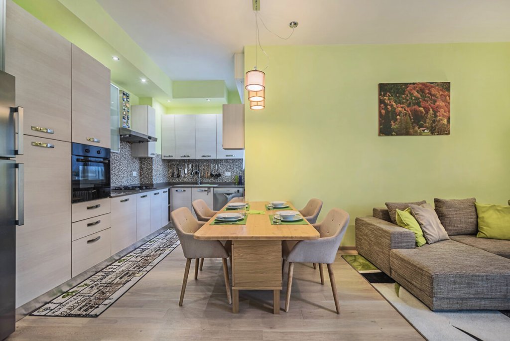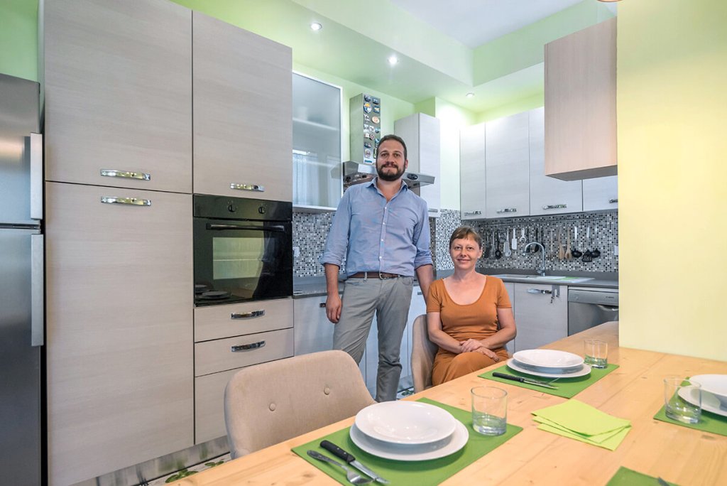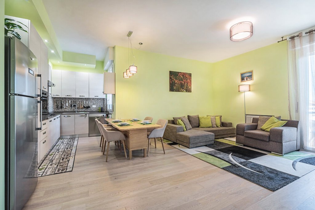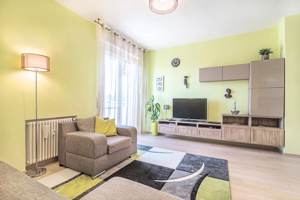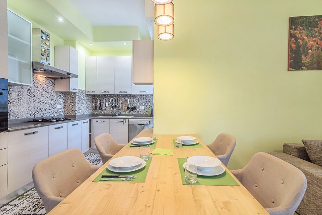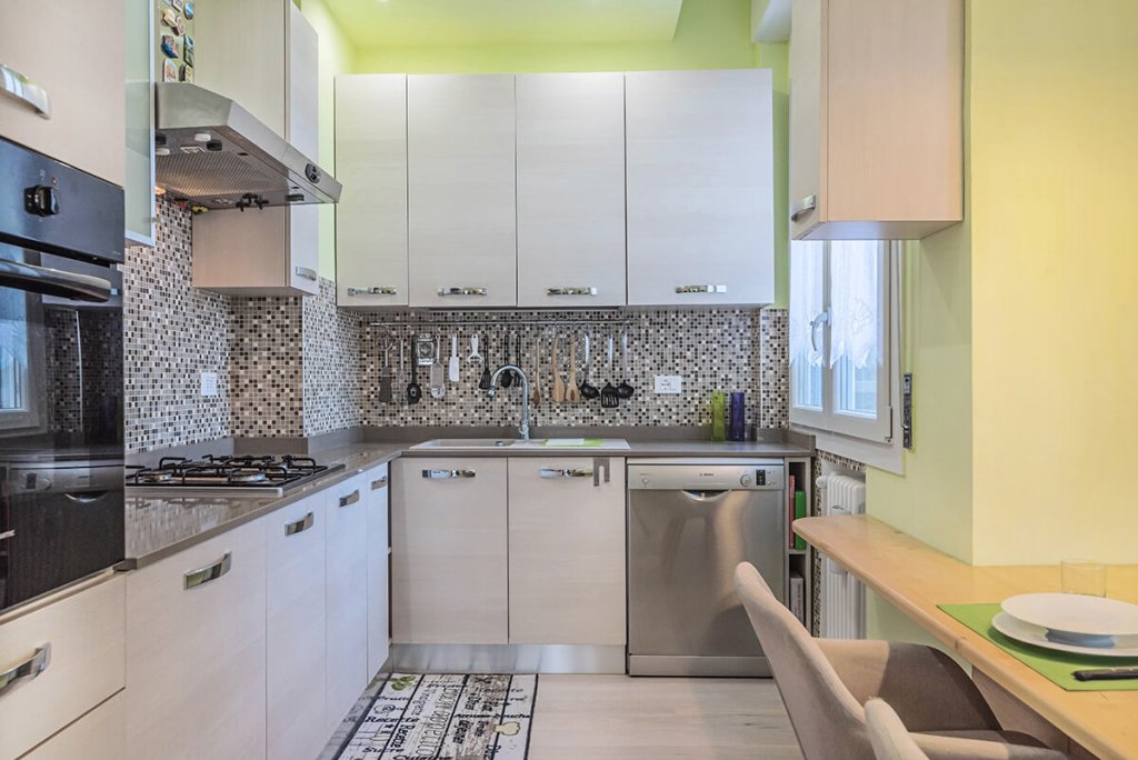 Ristrutturazione completa di un appartamento di 90 mq a Bologna, zona Navile realizzata dal nostro architetto Valerio Gori. Motivo principale della ristrutturazione è stata la necessità di ridistribuire gli spazi all'interno dell'abitazione appena acquistata e di rinnovare impianti, infissi e finiture. All'interno dell'appartamento è stata quindi creata un'ampia zona living open space con angolo cottura caratterizzato da uno splendido mosaico con funzione di paraschizzi, che stacca nettamente dalle altre pareti della stanza tinteggiate di un acceso verde mela che conferisce alla casa, insieme ai complementi d'arredo sui toni del marrone, un accento nordico oltre all'evidente gusto moderno che caratterizza sia l'arredo sia le geometrie degli spazi. I pavimenti della casa sono interamente rivestiti di parquet chiaro, ad eccezione del bagno in piastrelle Iperceramica sui toni del beige con una piccola striscia in mosaico che richiama la parete della cucina. Accogliente, infine, la camera da letto con le sue tonalità di giallo pastello che scaldano e diffondono la luce rendendo questo ambiente rilassante e ideale per riposare.