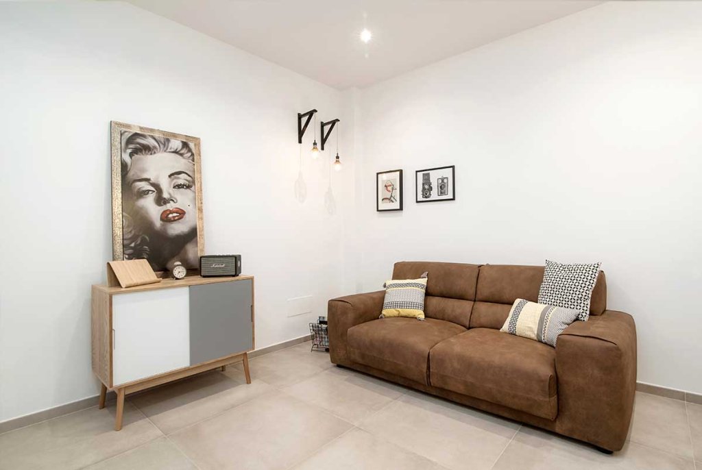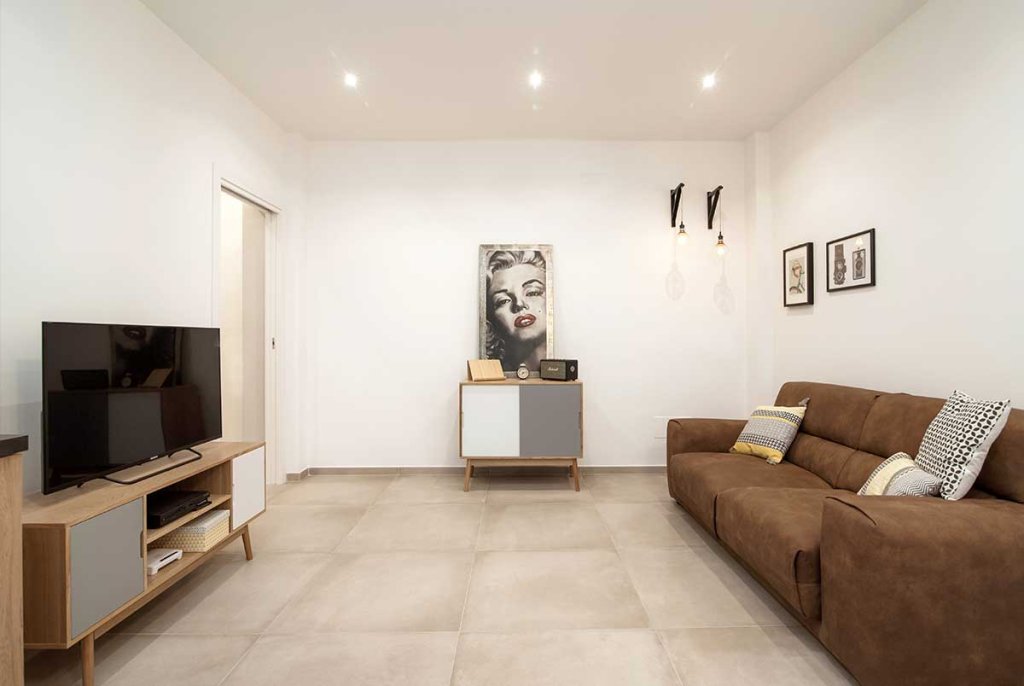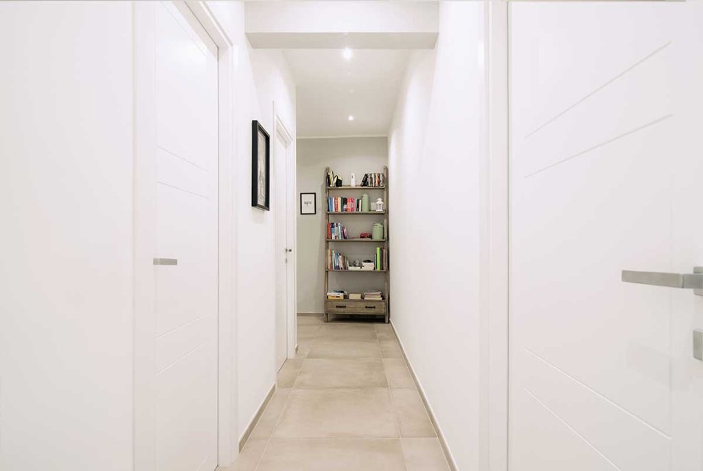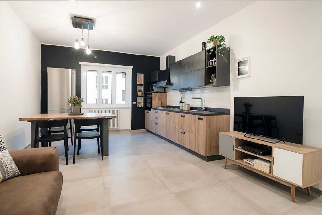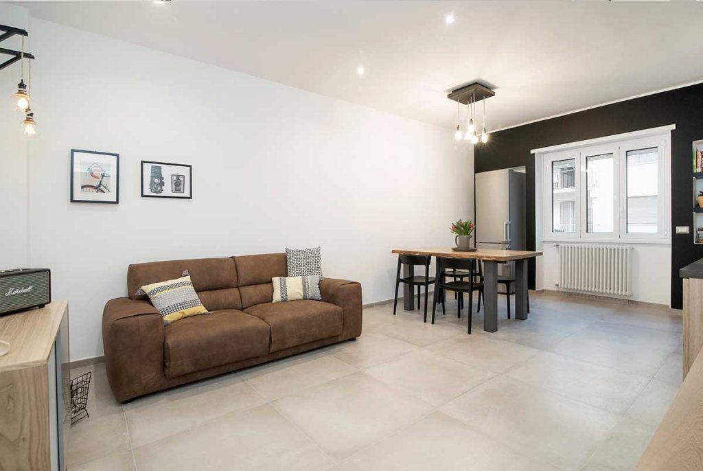 L'immobile di circa 70 mq, rimasto fermo agli anni '70, è stato completamente rinnovato e ristrutturato per ospitare una giovane coppia. La ristrutturazione, realizzata dal nostro architetto Vincenzo, ha previsto una nuova distribuzione degli spazi per cambiare completamente aspetto all'appartamento, rendendolo giovanile e fresco, su misura per i clienti. Con la nuova distribuzione degli spazi sono stati realizzati: un ingresso con disimpegno, un ambiente soggiorno living, due camere da letto e due bagni. Lo spazio, prima dedicato alla cucina, è stato utilizzato per realizzare una camera da letto in più con bagno interno, adatta per gli ospiti o in previsione di un allargamento della famiglia. La cucina, invece, è stata posta a vista nell'ampio open space, ideale per condividere il tempo con gli amici o la famiglia. Nella camera da letto matrimoniale è stata inserita una cabina armadio ad angolo, da tempo sognata dai clienti, che oltre ad essere funzionale aggiunge dinamicità allo spazio. Tutti gli spazi sono stati progettati con un gusto contemporaneo e arredati con uno stile industriale – nordico, caratterizzato da mobili in legno chiaro dal colore naturale in tinta con il pavimento, filo conduttore dell’appartamento, realizzato con un grès porcellanato di grande formato (75×75 cm) di colore beige. La cucina, posta a vista nel grande open space, è caratterizzata da una parete tinteggiata con effetto lavagna e da arredi che alternano le tinte naturali del legno al nero verniciato con effetto spugnato. Il grande tavolo posto al centro dell'open space è un pezzo unico dalle fatture artigianali che dona carattere allo spazio. Nella camera da letto doppia ritroviamo arredi nello stesso stile del soggiorno, così da creare uno stile unico e coerente in tutta la casa. I due bagni sono stati rivestiti con piastrelle in grès sui toni neutri del beige, con arredi in legno naturale che ben si sposano con questi. L'illuminazione di tutto l'appartamento è stata realizzata con faretti a led incassati nel controsoffitto, che permettono un notevole risparmio energetico.