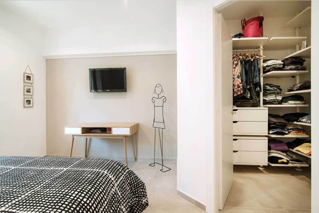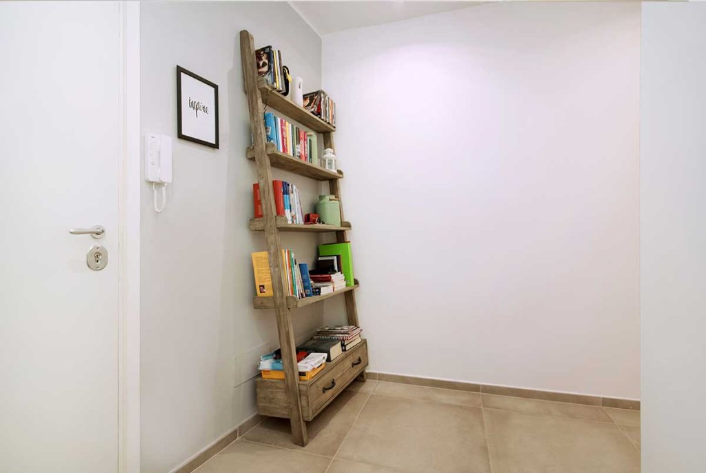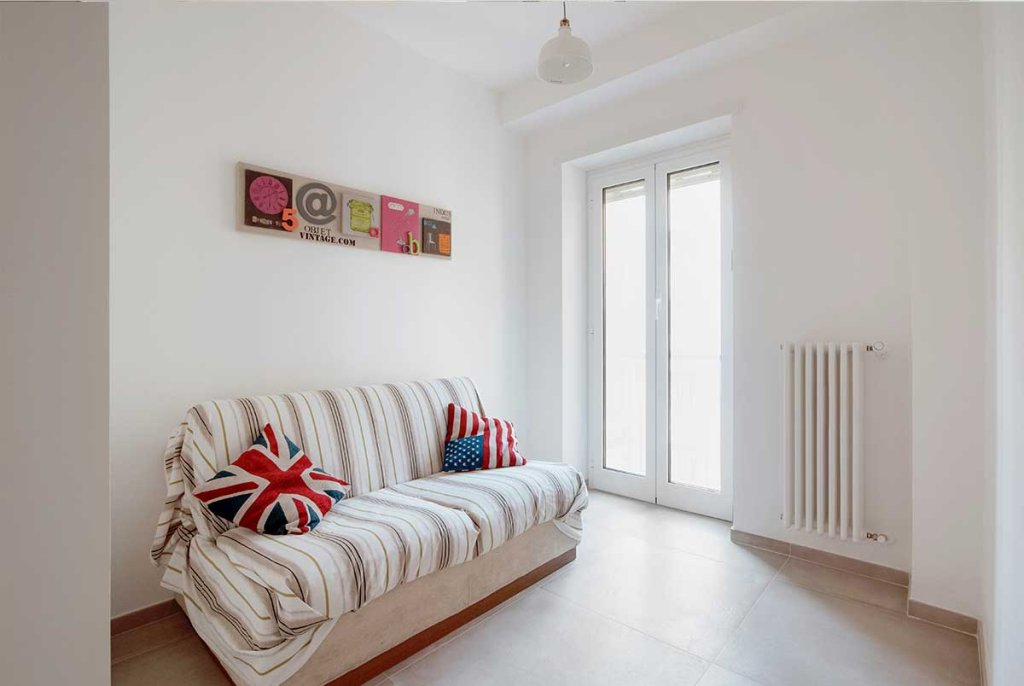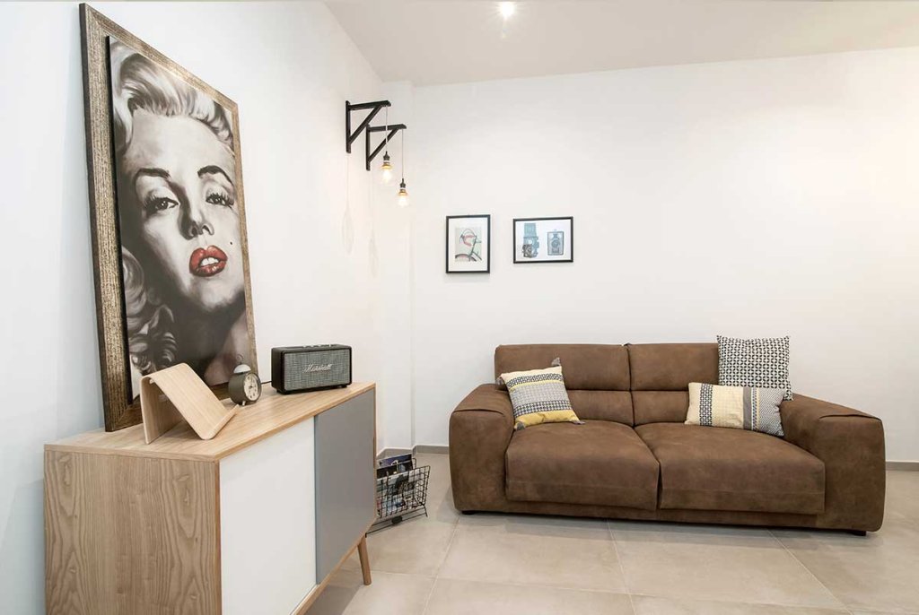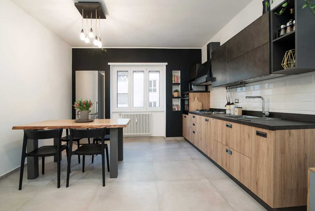 L'immobile di circa 70 mq, rimasto fermo agli anni '70, è stato completamente rinnovato e ristrutturato per ospitare una giovane coppia. La ristrutturazione, realizzata dal nostro architetto Vincenzo, ha previsto una nuova distribuzione degli spazi per cambiare completamente aspetto all'appartamento, rendendolo giovanile e fresco, su misura per i clienti. Con la nuova distribuzione degli spazi sono stati realizzati: un ingresso con disimpegno, un ambiente soggiorno living, due camere da letto e due bagni. Lo spazio, prima dedicato alla cucina, è stato utilizzato per realizzare una camera da letto in più con bagno interno, adatta per gli ospiti o in previsione di un allargamento della famiglia. La cucina, invece, è stata posta a vista nell'ampio open space, ideale per condividere il tempo con gli amici o la famiglia. Nella camera da letto matrimoniale è stata inserita una cabina armadio ad angolo, da tempo sognata dai clienti, che oltre ad essere funzionale aggiunge dinamicità allo spazio. Tutti gli spazi sono stati progettati con un gusto contemporaneo e arredati con uno stile industriale – nordico, caratterizzato da mobili in legno chiaro dal colore naturale in tinta con il pavimento, filo conduttore dell’appartamento, realizzato con un grès porcellanato di grande formato (75×75 cm) di colore beige. La cucina, posta a vista nel grande open space, è caratterizzata da una parete tinteggiata con effetto lavagna e da arredi che alternano le tinte naturali del legno al nero verniciato con effetto spugnato. Il grande tavolo posto al centro dell'open space è un pezzo unico dalle fatture artigianali che dona carattere allo spazio. Nella camera da letto doppia ritroviamo arredi nello stesso stile del soggiorno, così da creare uno stile unico e coerente in tutta la casa. I due bagni sono stati rivestiti con piastrelle in grès sui toni neutri del beige, con arredi in legno naturale che ben si sposano con questi. L'illuminazione di tutto l'appartamento è stata realizzata con faretti a led incassati nel controsoffitto, che permettono un notevole risparmio energetico.
