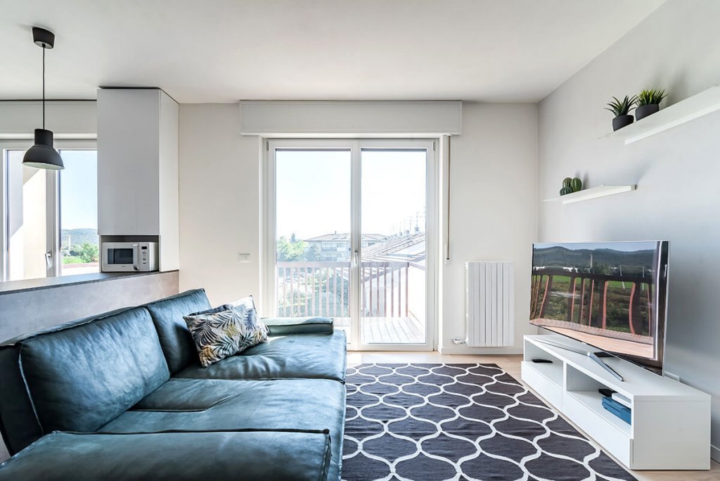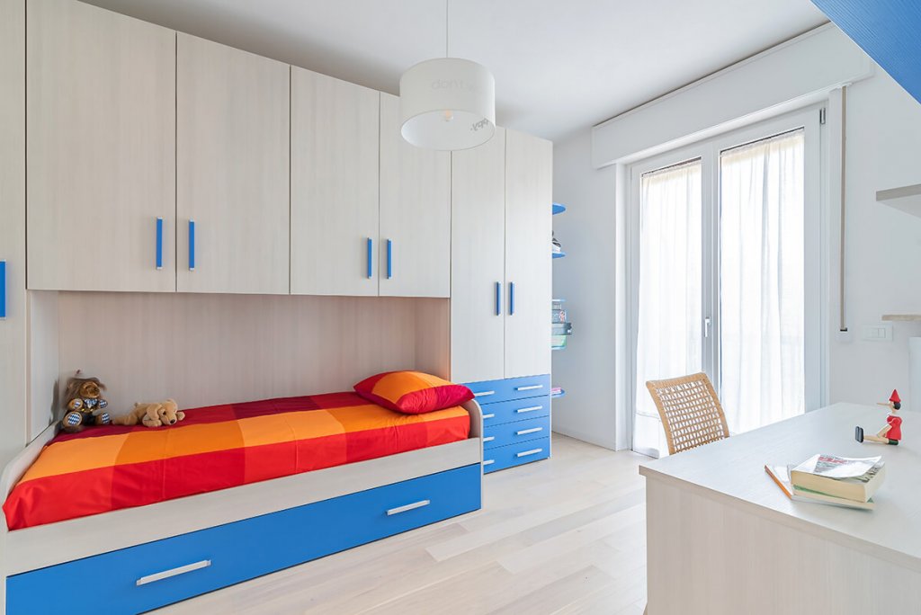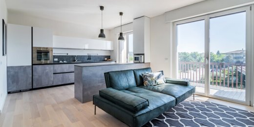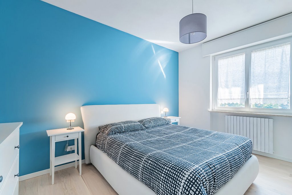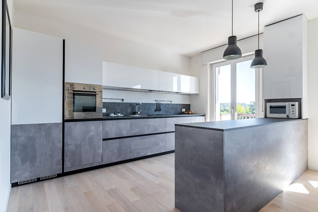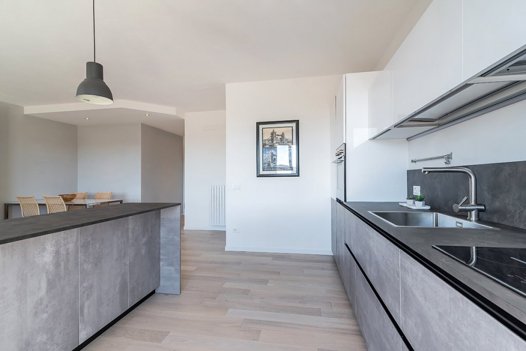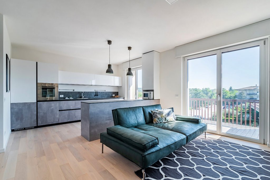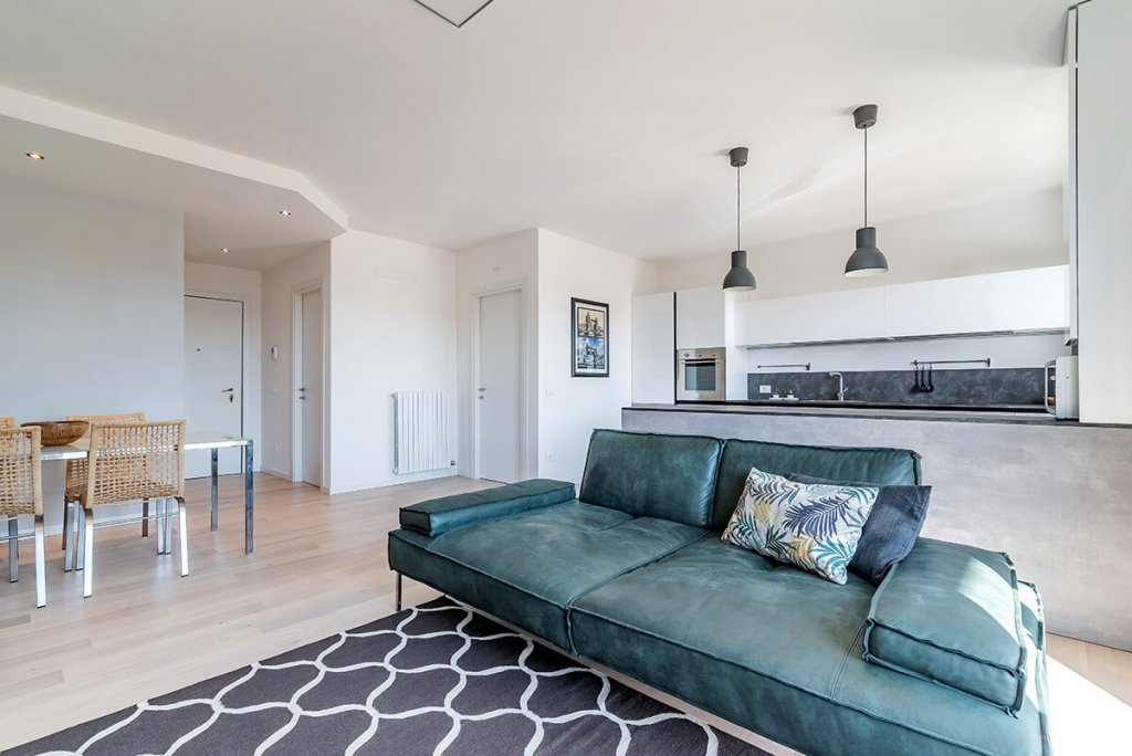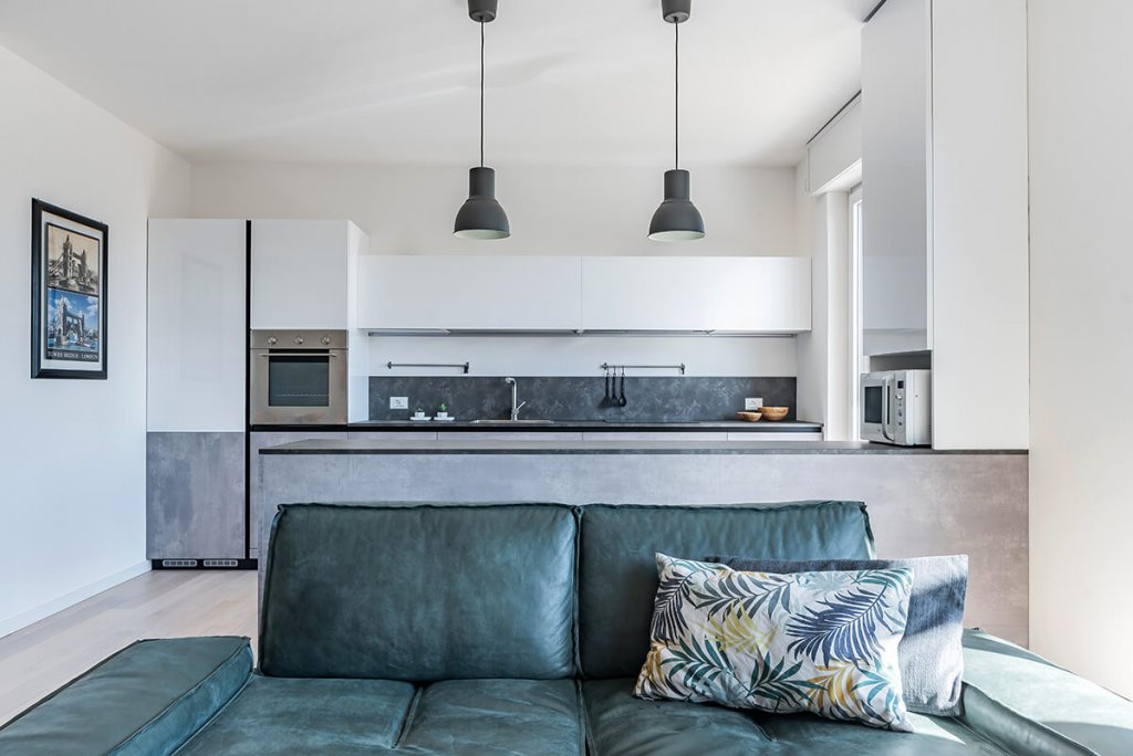 Sono le nuance chiare e un gusto decisamente nordico e contemporaneo a caratterizzare la ristrutturazione a Verona di questo delizioso appartamento, opera dell'Arch. Sofia Bertoldi. Mossi dalla necessità di ampliare gli spazi interni della casa rivalorizzando ogni angolo e attribuendogli uno stile ben definito, il progetto ha previsto l'apertura della cucina sul soggiorno (con conseguente creazione di uno spazioso Open Space), la riduzione dei metri quadri dedicati al corridoio e la creazione di un comodo ripostiglio in ingresso. Appena varcata la porta si viene accolti subito in un caldo living, caratterizzato dal pavimento in parquet chiaro, divano in pelle verde scura e un'elegante cucina strutturata di fronte alla parete attrezzata della tv. Divisa visivamente in due dal colore, la cucina vanta come rivestimento dei pannelli inferiori un laminato grigio effetto cemento che si lega alla tinta del paraschizzi e contrasta perfettamente il bianco lucido dei pensili e dei pannelli superiori di frigo e forno. A separare la cucina dal divano è invece un tavolo all'americana, illuminato sapientemente da due sospensioni dal carattere industrial. Procedendo verso la zona notte si incontrano tre ambienti: un bagno, una camera da letto e una cameretta, che si contraddistingue per i mobili legno dai dettagli blu. La stanza matrimoniale, rilassante e moderna, vanta invece una parete blu alle spalle del letto e mobili a contrasto in legno bianco. Il blu viene richiamato anche nei dettagli del bagno, precisamente su mobiletto a giorno e biancheria, e si lega in maniera elegante con il legno dei mobili e con il bianco dei rivestimenti in ceramica posati a mezza altezza. Particolare è il bicolore di questo ambiente: chiaro nella parte bassa e grigio a contrasto nella metà superiore. Completano il bagno due sanitari sospesi e una vasca filo muro, comoda e spaziosa. Scopri la sede di Facile Ristrutturare a Verona!