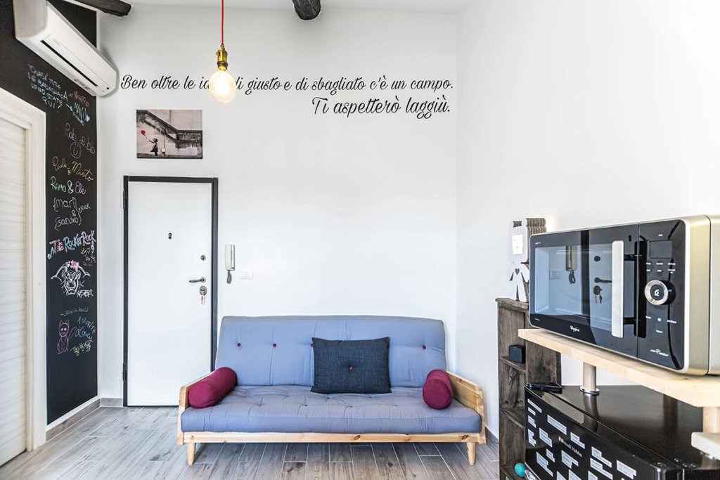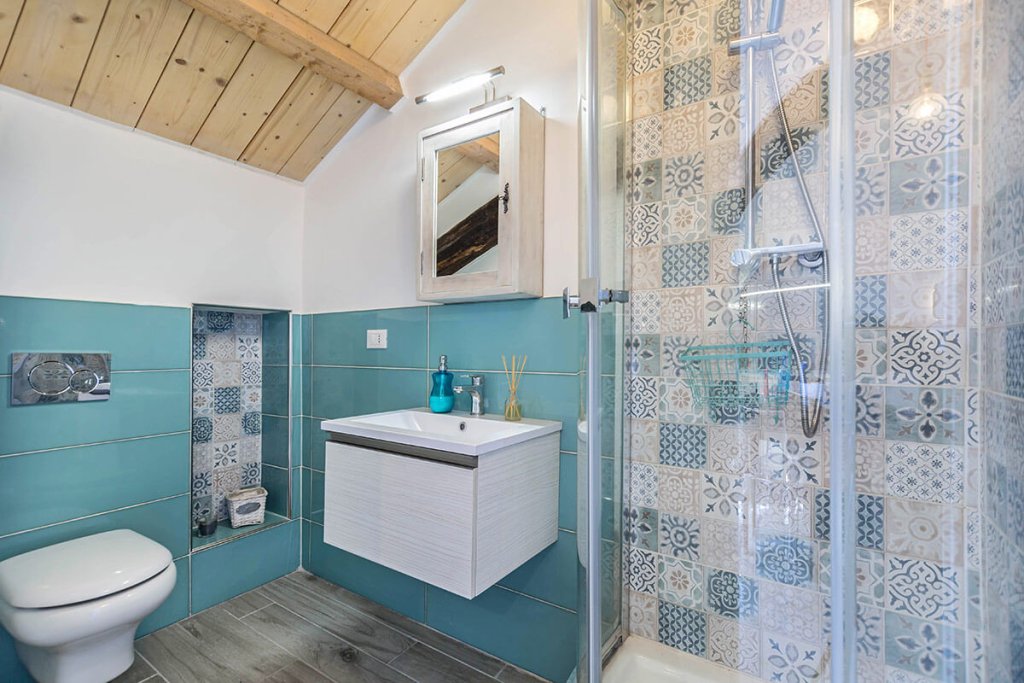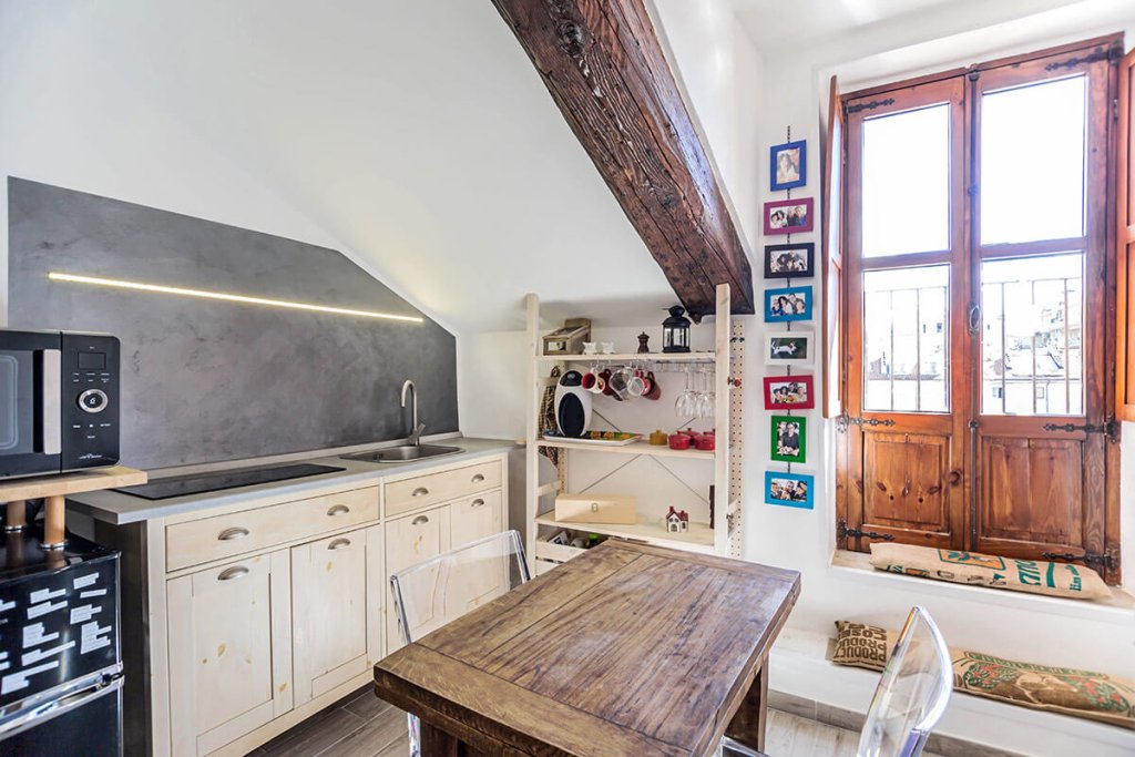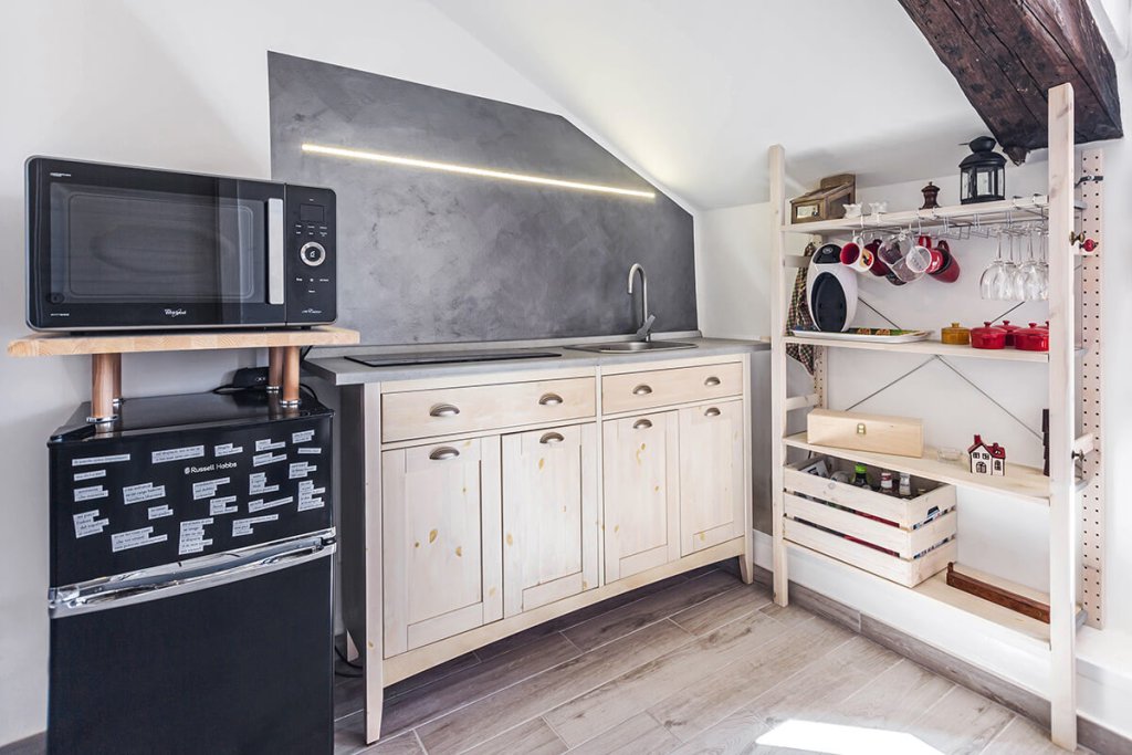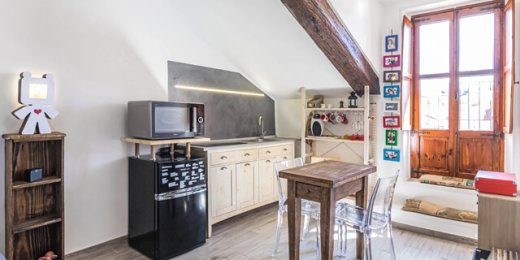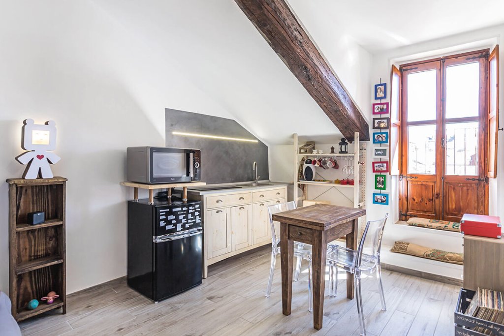 Ristrutturazione completa di una mansarda di 28 mq a Torino, zona Centro, realizzata dal nostro architetto Irene Maglio. L’appartamento, abitazione secondaria dei proprietari che vivono fuori città, è stato completamente rammodernato. La sfida? Riuscire ad organizzare gli ambienti in modo tale da rendere il poco spazio a disposizione più funzionale e, di conseguenza, più vivibile. In quest'ottica, è stata quindi creata una accogliente zona giorno con pavimento in grès effetto legno e pareti bianche, angolo cottura con paraschizzi stile stucco veneziano grigio e una piccola striscia di strip led, con tavolo al centro e divanetto. La mansarda ha mantenuto il suo originario aspetto rustico grazie alle caratteristiche travi in legno a vista che corrono lungo il soffitto inclinato, tinteggiato di bianco. Lo spazio è stato ulteriormente vivacizzato dalla piccola rientranza di una delle quattro pareti della stanza, dipinta con vernice a lavagna che dona al progetto un ulteriore tocco di originalità. Nel bagno si è infine cercato di gestire al meglio il ridotto spazio a disposizione. Si è quindi deciso di inserire un piccolo lavabo squadrato che riprendesse le forme semplici e lineari dell’appartamento e una doccia curvilinea che contrastasse con il resto dell’arredamento, donando un tocco di eleganza allo stile moderno della mansarda. Per quanto riguarda le pareti della doccia, si è optato per un rivestimento in piastrelle bicottura azzurro e stile cementine, in continuità con quelle della piccola nicchia rettangolare posta su una delle quattro pareti. Si è così riusciti nello scopo di aggiungere un tocco di colore all'insieme, in aggiunta alla cromia del legno del soffitto lasciato a vista.